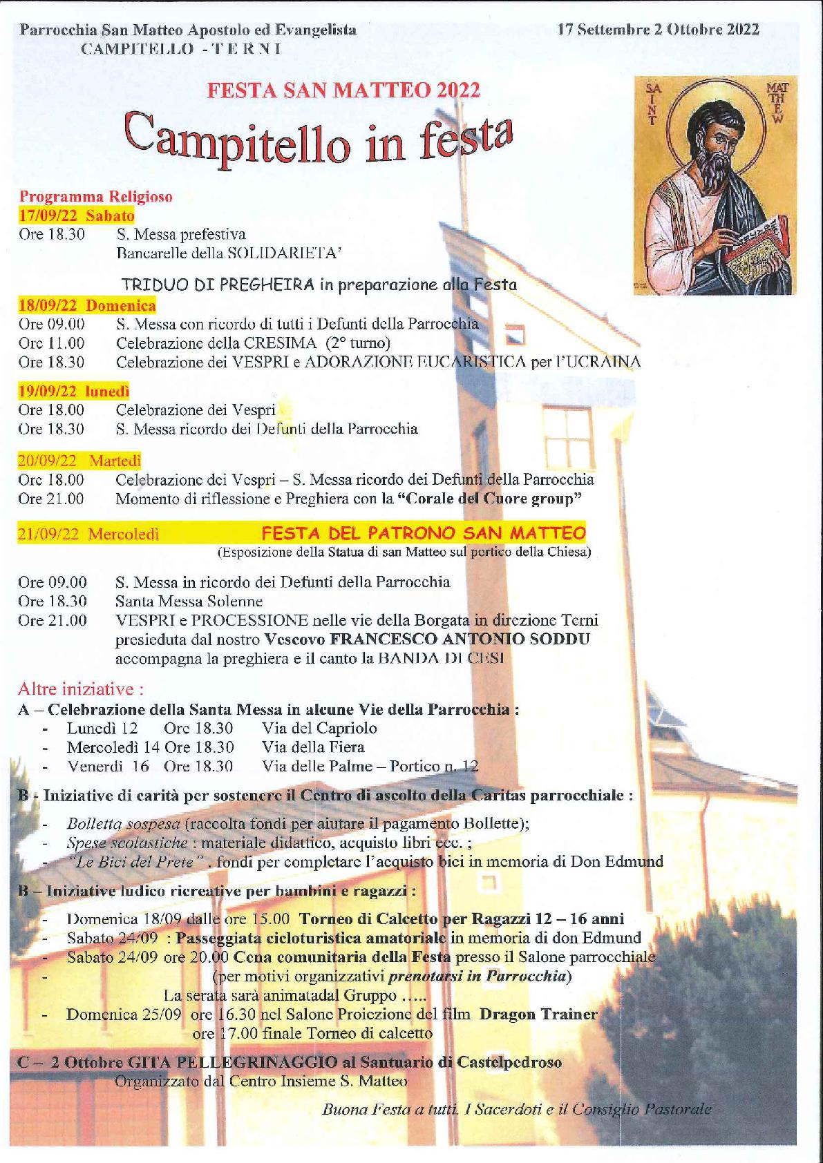 La parrocchia di San Matteo Apostolo ed Evangelista in Campitello festeggia il patrono con una serie di manifestazioni.