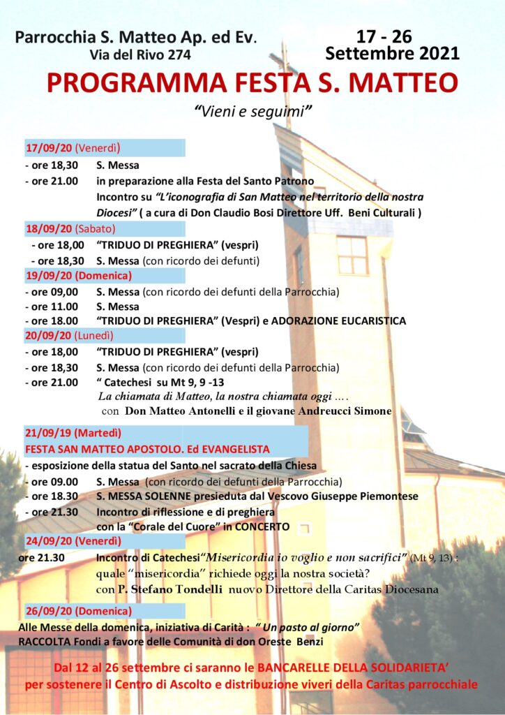 – ore 21.00 in preparazione alla festa del patrono l’incontro su: “L’iconografia di San Matteo nel territorio della nostra  diocesi” a cura di Don Claudio Bosi, Direttore Ufficio Beni culturali.