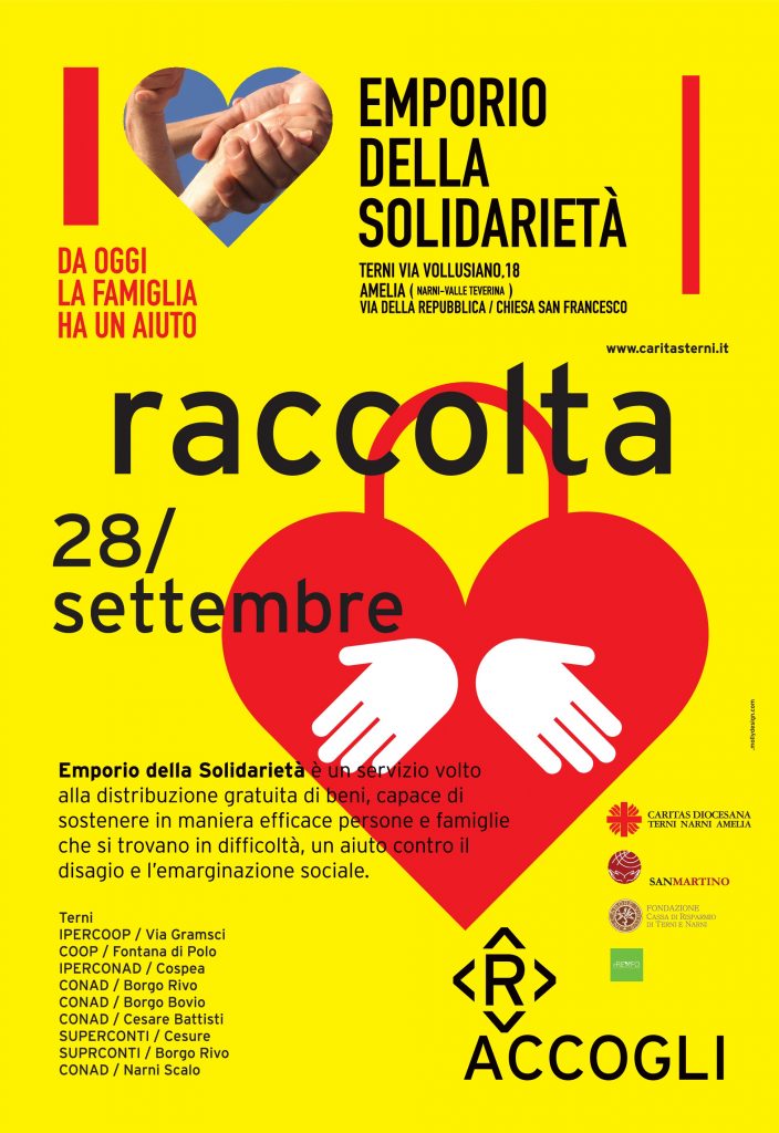 La Caritas diocesana e l’associazione di volontariato San Martino, in collaborazione con le parrocchie inserite nel progetto “Emporio della solidarietà”, organizzano la raccolta alimentare per sostenere l’attività dell’emporio solidale di Terni, presso il centro di ascolto di via Vollusiano, per incrementare la disponibilità di beni di prima necessità e svolgere un servizio sempre più esteso ed efficace a fronte delle crescenti richieste di nuclei familiari in difficoltà.