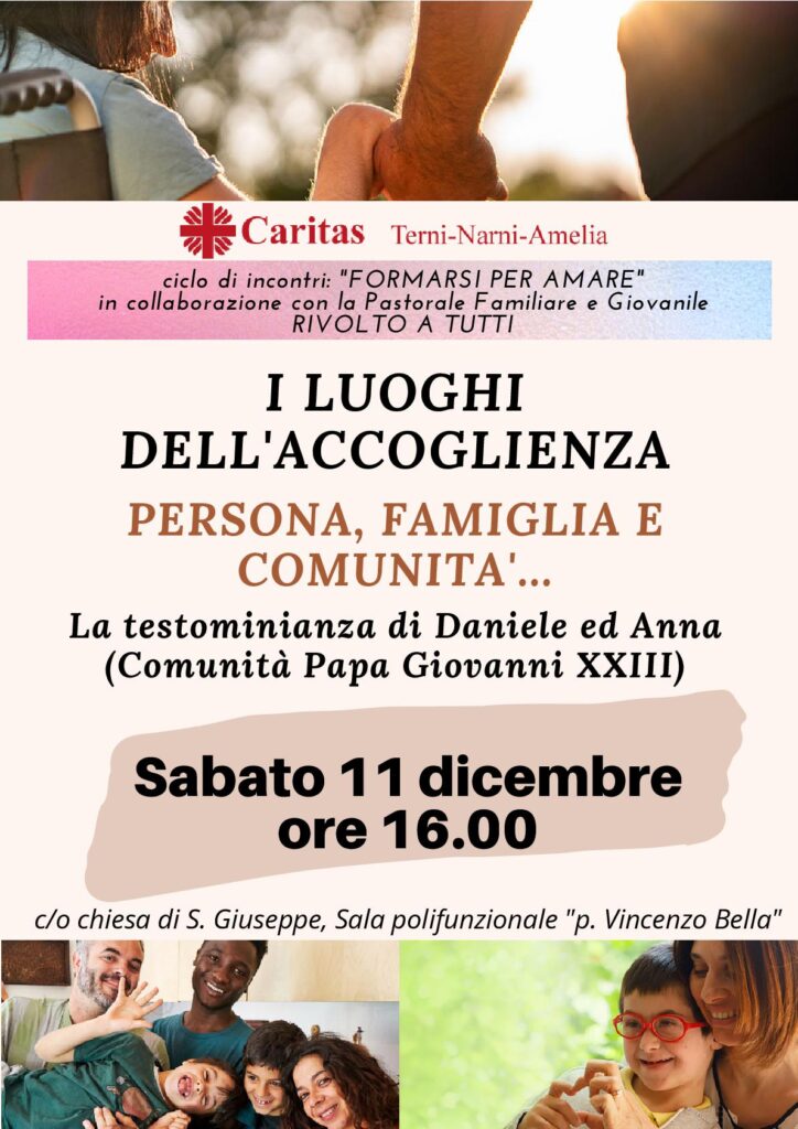 Sabato 11 dicembre alle ore 16 presso la sala polifunzionale “Vincenzo Bella” accanto alla chiesa di San Giuseppe a Terni si terrà l’incontro di Avvento della Caritas Diocesana. Il tema è: “Vivere la carità non è per specialisti, ma per tutti: ogni comunità, famiglia o persona” con la testimonianza di una giovane coppia della comunità “Papa Giovanni XXIII”, Daniele ed Anna, di Massa Martana.