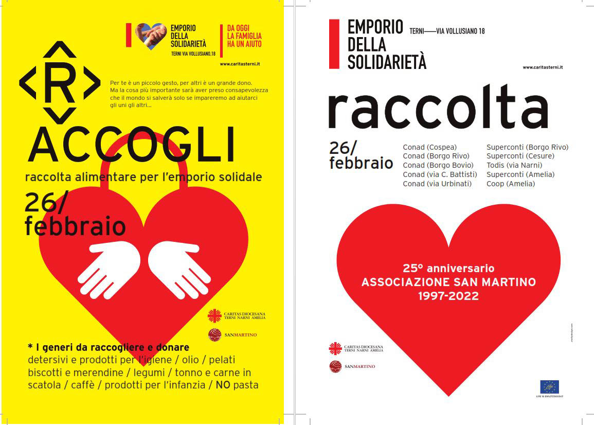 Nella giornata di sabato 26 febbraio si terrà nei supermercati di Terni, Narni, Amelia la raccolta alimentare promossa dalla Caritas diocesana per sostenere l’attività dell’emporio solidale di Terni, presso il centro di ascolto di via Vollusiano, e all’emporio solidale di Amelia presso la Cittadella della Solidarietà in via della Repubblica, per incrementare la disponibilità di beni di prima necessità e svolgere un servizio sempre più esteso ed efficace a fronte delle crescenti richieste di nuclei familiari in difficoltà. Quest’anno la raccolta cade anche nel 25° anniversario dell’associazione San Martino che gestisce l’Emporio e le altre opere segno della Caritas.