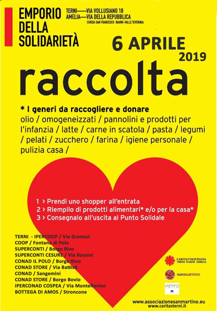 La Caritas diocesana e l’associazione di volontariato San Martino, in collaborazione con le parrocchie inserite nel progetto “Emporio della solidarietà”, organizzano la raccolta alimentare per sostenere l’attività dell’emporio solidale di Terni, presso il centro di ascolto di via Vollusiano, per incrementare la disponibilità di beni di prima necessità e svolgere un servizio sempre più esteso ed efficace a fronte delle crescenti richieste di nuclei familiari in difficoltà.