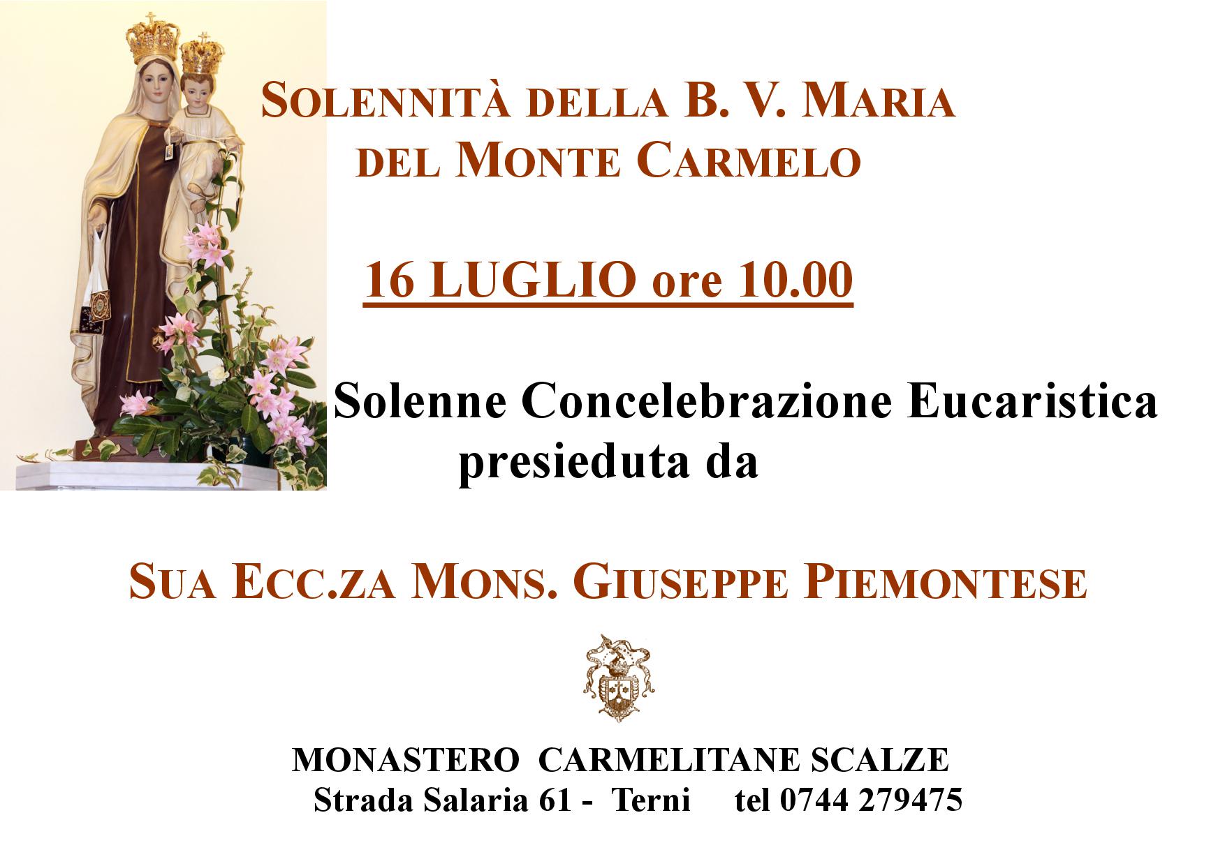 In occasione della solennità della Madonna del monte Carmelo, sabato 16 luglio alle ore 10 presso il monastero delle Carmelitane scalze di Macchia di Bussone si terrà la solenne concelebrazione presieduta dal vescovo Giuseppe Piemontese.