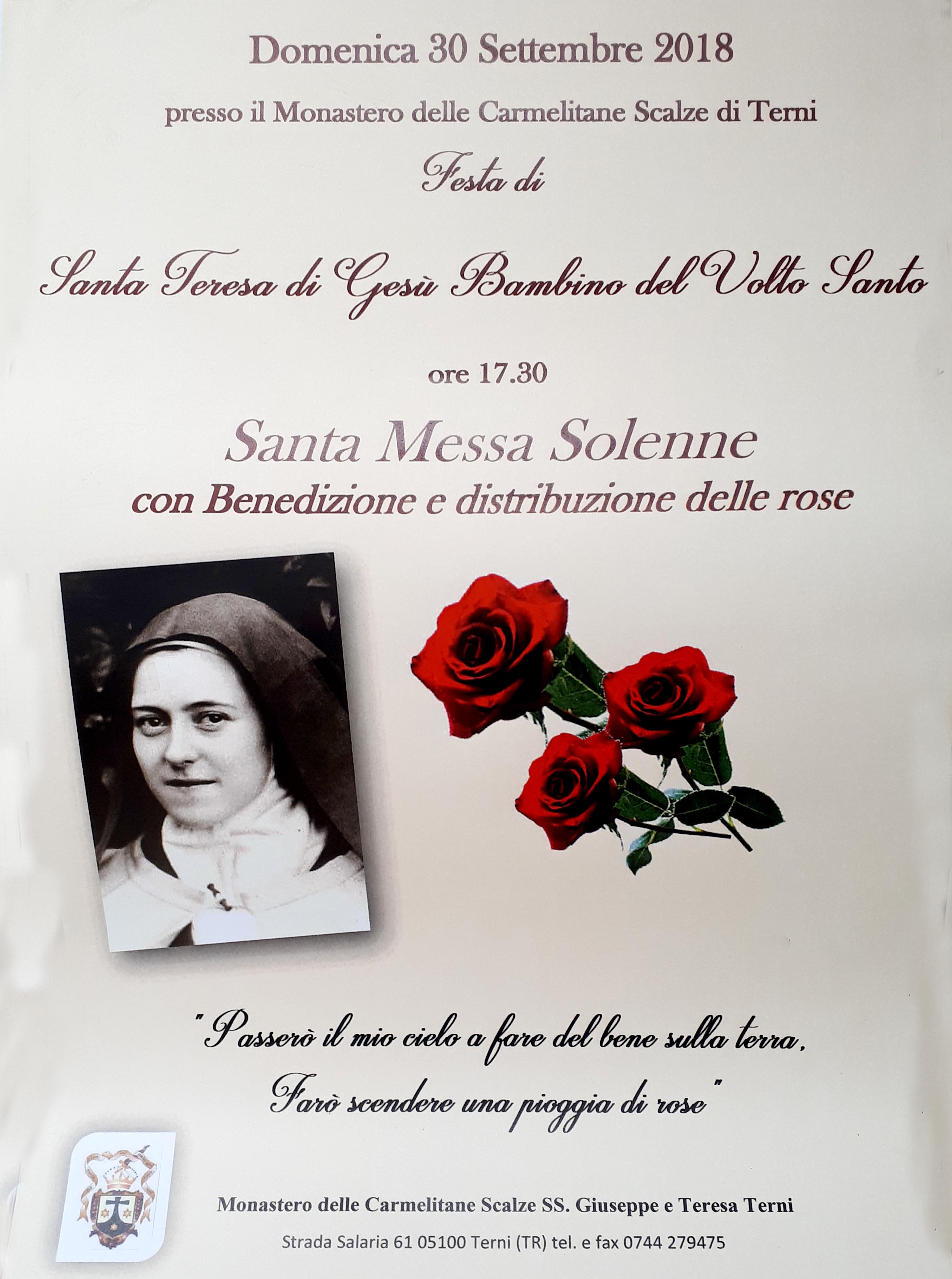 Domenica 30 settembre alle ore 17.30 presso la chiesa del monastero delle Carmelitane scalze di Terni sarà celebrata la messa solenne per la festa di Santa Teresa di Gesù Bambino con la distribuzione delle rose