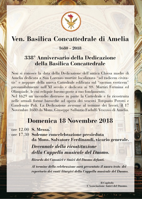 Con una solenne concelebrazione eucaristica presieduta dal vicario generale Mons. Salvatore Ferdinandi, Domenica 18 novembre nella Concattedrale di Amelia si farà memoria del 338° Anniversario della sua Dedicazione.