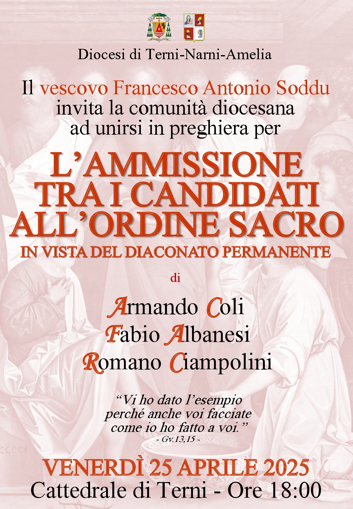Nella Cattedrale di Terni il 25 aprile il vescovo Francesco Soddu ha presieduto la Celebrazione Eucaristica per l’ammissione agli Ordini Sacri verso il diaconato permanente di Armando Coli della parrocchia di Santa Maria della Misericordia , Fabio Albanesi della parrocchia di San Francesco a Terni, Romano Ciampolini della parrocchia di Santa Maria Assunta della Cattedrale.