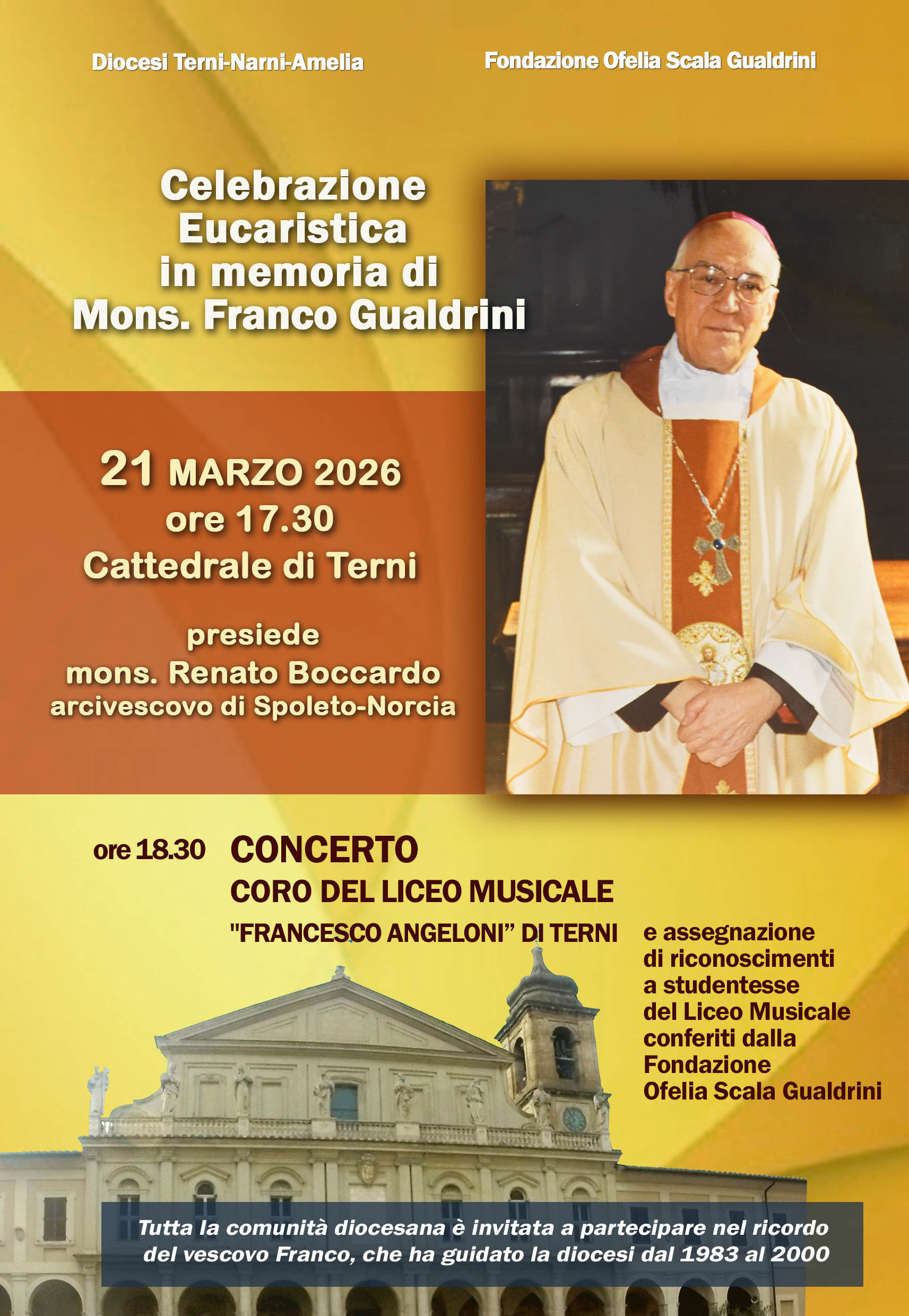 In occasione del 16° anniversario della morte di mons. Franco Gualdrini, vescovo di Terni-Narni-Amelia dal 1983 al 2000, è stata celebrata sabato 21 marzo, nella cattedrale di Terni la Santa Messa presieduta da mons. Renato Boccardo arcivescovo di Spoleto-Norcia, concelebrata da mons. Francesco Soddu amministratore apostolico della diocesi di Terni-Narni-Amelia e da numerosi sacerdoti della diocesi.