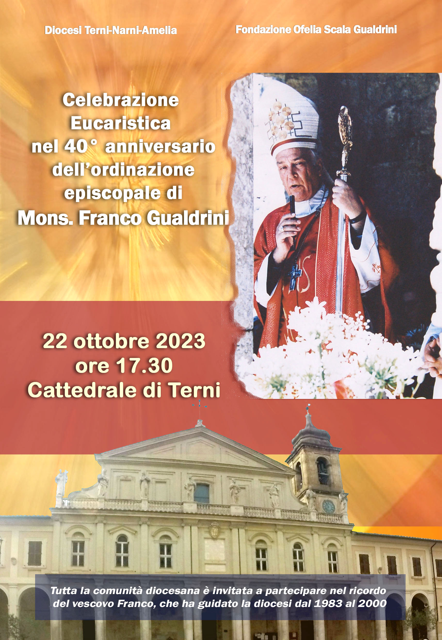 Domenica 22 ottobre sarà ricordato mons. Franco Gualdrini, vescovo di Terni Narni Amelia dal 1983 al 2000, nel 40° anniversario dell’ordinazione episcopale e ingresso nella diocesi di Terni-Narni-Amelia avvenuta il 22 ottobre 1983. La solenne celebrazione alle ore 17.30 nella Cattedrale di Terni, nella cui cripta si trova la tomba di mons. Gualdrini, sarà presieduta dal vicario generale della diocesi mons. Salvatore Ferdinandi, concelebrata dai sacerdoti della diocesi. Tutta la comunità diocesana è invitata a partecipare.