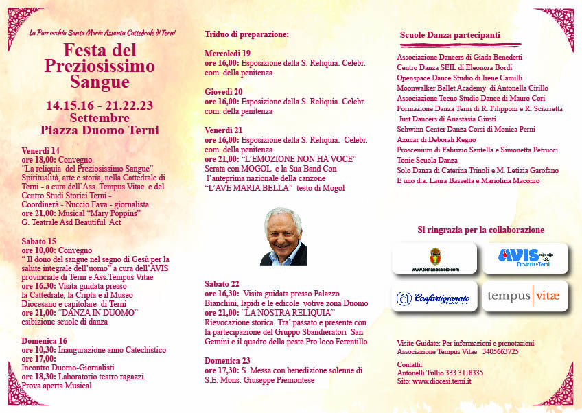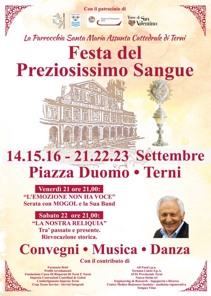 La parrocchia di Santa Maria Assunta della Cattedrale di Terni celebra la festa del Preziosissimo Sangue dal 14 al 23 settembre. Una festa della comunità parrocchiale che segna l’inizio del nuovo anno pastorale e la ripresa del cammino che coinvolge i diversi gruppi, associazioni, scuola catechistica.