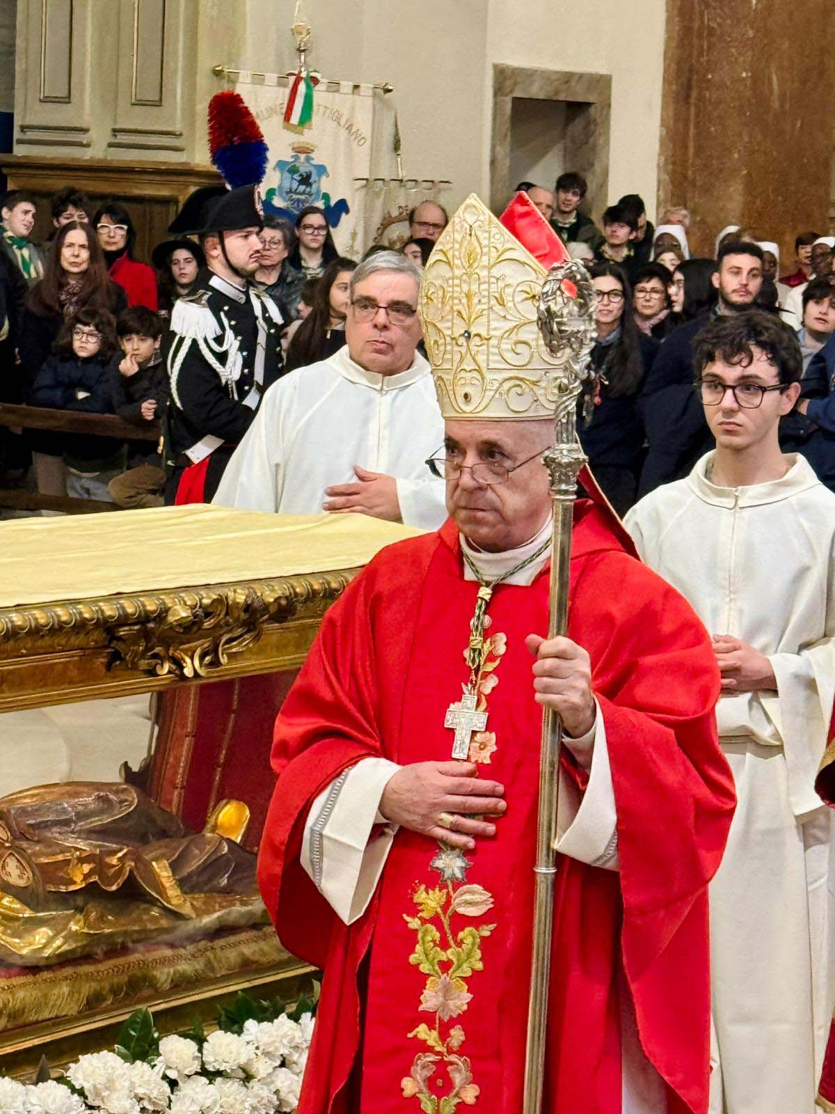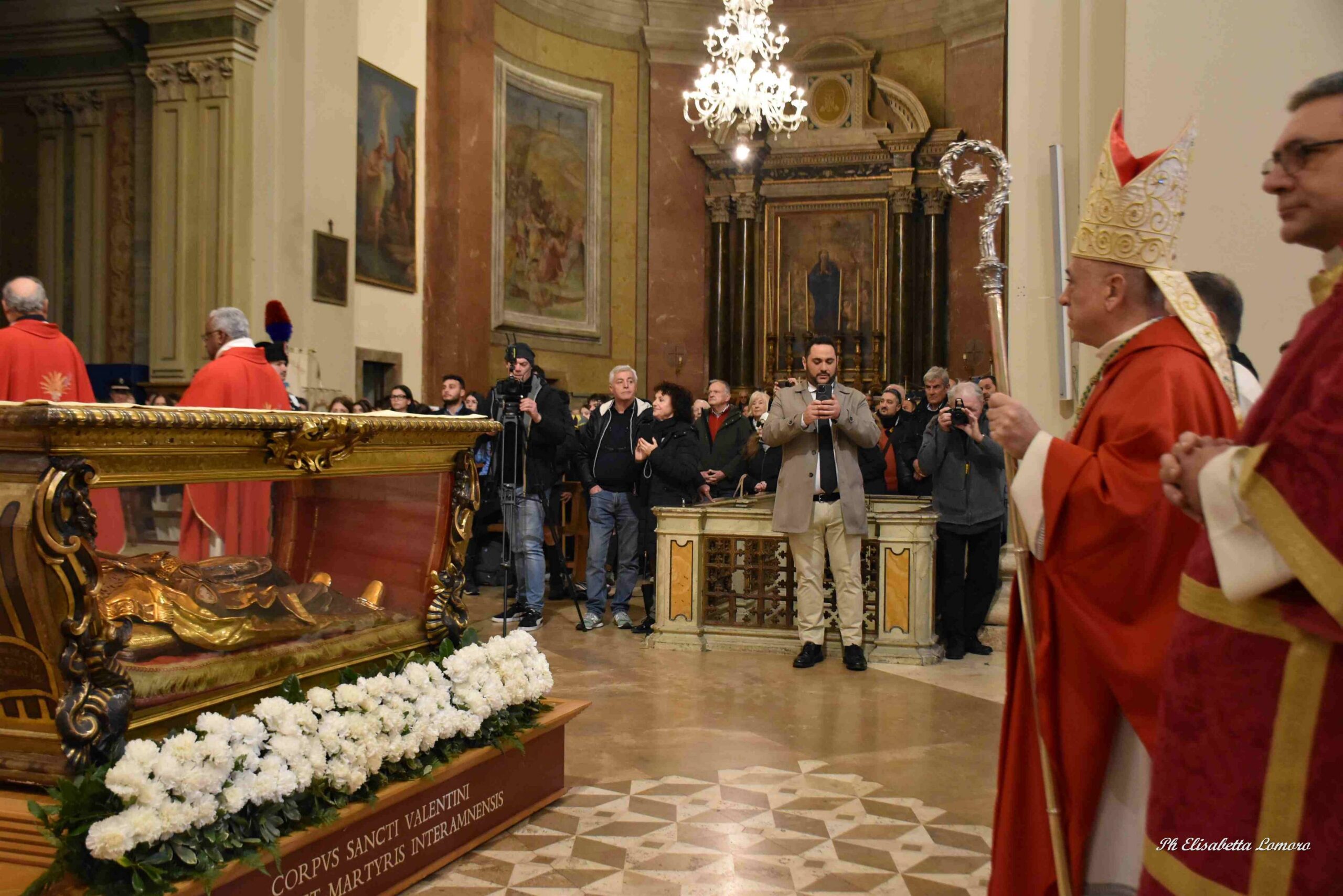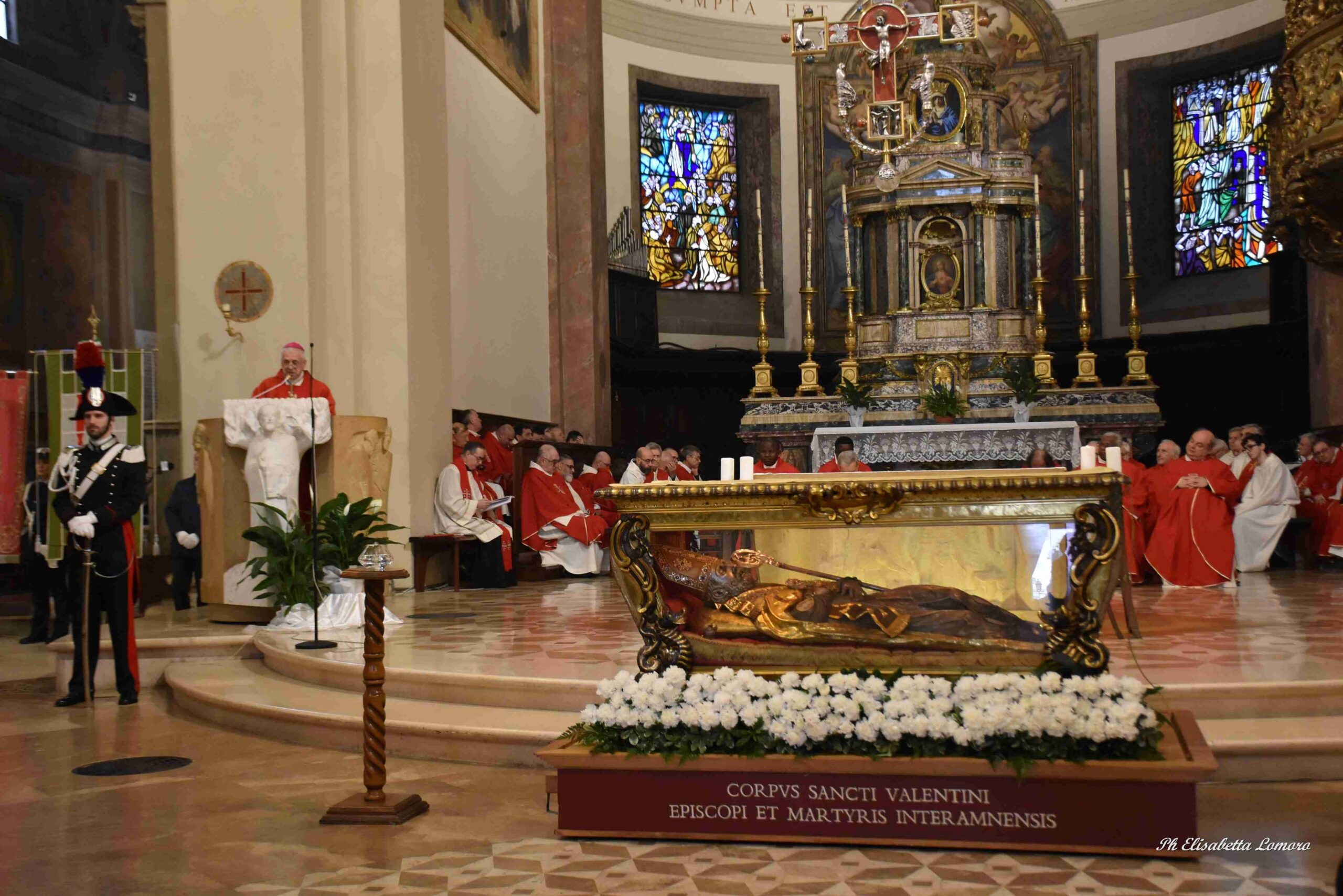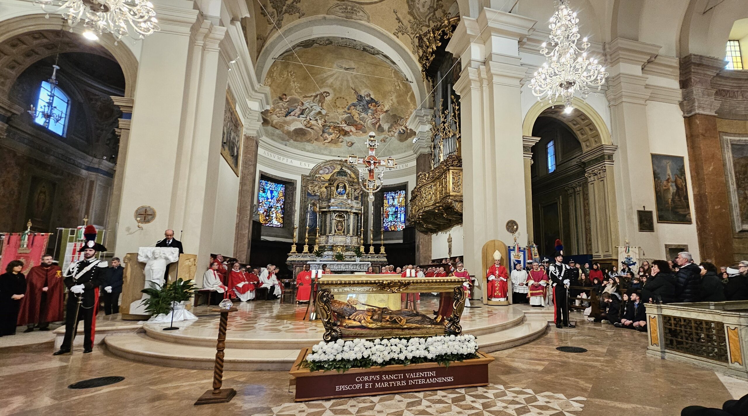 In una cattedrale gremita di fedeli è stata celebrata domenica 15 febbraio la festa diocesana di San Valentino, con il solenne pontificale presieduto dal vescovo Francesco Antonio Soddu, In una cattedrale gremita di fedeli è stata celebrata domenica 15 febbraio la festa diocesana di San Valentino, con il solenne pontificale presieduto dal vescovo Francesco Antonio Soddu, concelebrato da mons. Salvatore Ferdinandi, vicario generale della Diocesi, da padre Josline Peediakkel parroco di San Valentino, dai i vicari foranei ed episcopali, il clero diocesano. Alla celebrazione hanno partecipato il prefetto di Terni Antonietta Orlando, la presidente della Regione Umbria Stefania Proietti, Francesco Maria Ferranti vicepresidente della Provincia di Terni, il Procuratore della Repubblica di Terni Antonio Laronga, la presidente del Consiglio Comunale di Terni Sara Francescangeli, assessori e consiglieri della Regione Umbria, consiglieri del Comune di Terni, sindaci dei Comuni del comprensorio diocesano, autorità militari provinciali e regionali, cavalieri e dame dell’Ordine Equestre del Santo Sepolcro di Gerusalemme, dell’ordine Constantiniano, rappresentanti del mondo del lavoro e delle associazioni di categoria, della scuola, delle associazioni, gruppi giovanili e Scout d’Europa, Terni 9 e Terni 2, e movimenti della Diocesi.