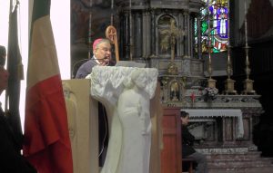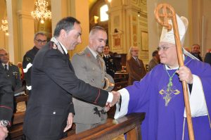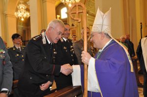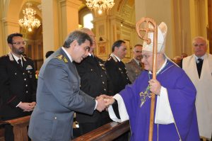 “Oggi siamo chiamati a celebrare questa preparazione alla Pasqua – ha detto il vescovo – nell’incontro con il Signore per raccontargli e presentargli le vicende della nostra vita, eventi belli e tristi, successi e sconfitte, personali e familiari. Il Signore, dopo averci ascoltato, è disposto a curare le nostre ferite, a colmare i nostri limiti, a ridarci speranza, a sostenere i nostri progetti di bene. approfondire il senso della Pasqua evento fondante del cristianesimo e della vita cristiana. Il vostro precetto pasquale è entrato nella nostra trazione ed è caratterizzante della personale adesione alla chiesa e a Cristo. Attraverso l’umile ricerca di Dio, l’ascolto assiduo della Parola si giunge alla pienezza della umanità e alle altezze della spiritualità, in una relazione amichevole con Dio, che durerà per sempre”. Parlando delle insegne simboli di gruppi militari il vescovo ha ricordato come “anche il cristiano ha le sue insegne e vessillo che è Cristo crocifisso, la croce”. “Nella nostra esperienza specie di fronte alle difficoltà della vita perdiamo la fede e ci ribelliamo a Dio, diventiamo indifferenti e ci lasciamo andare ad un ateismo pratico. Ma se ci rivolgiamo al Signore con fede saremo guariti. E’Gesù crocifisso il vessillo a cui rivolgerci per chiedere la salvezza. Gesù è mandato nel nome del Padre per dimostrare l’amore più grande che c’è, come quando nel servizio un soldato dona la propria vita. Gesù non ha cercato la morte, ma ha donato la sua vita, così anche noi ci dobbiamo mettere in questa dimensione. Il cristiano accoglie Gesù innalzato e crocifisso, morto e risorto, volge lo sguardo al cielo e a Lui si rivolge con fiducia nel cammino della vita, così si viene salvati e guariti dal peccato, si torna a far parte della comunità dei credenti salvati, un popolo pacifico. Ciascuno di voi e l’intera comunità delle Forze armate custodiscano e testimonino il segreto cristiano. Se si vuole conquistare la libertà e custodire l’identità di un popolo e di una nazione e se si vuole la pace vera non basta l’impegno quotidiano che è necessario ma occorre avere come riferimento il cielo, guardare e aderire al vessillo che è Cristo che con il dono della sua vita ha acquistato la salvezza”.