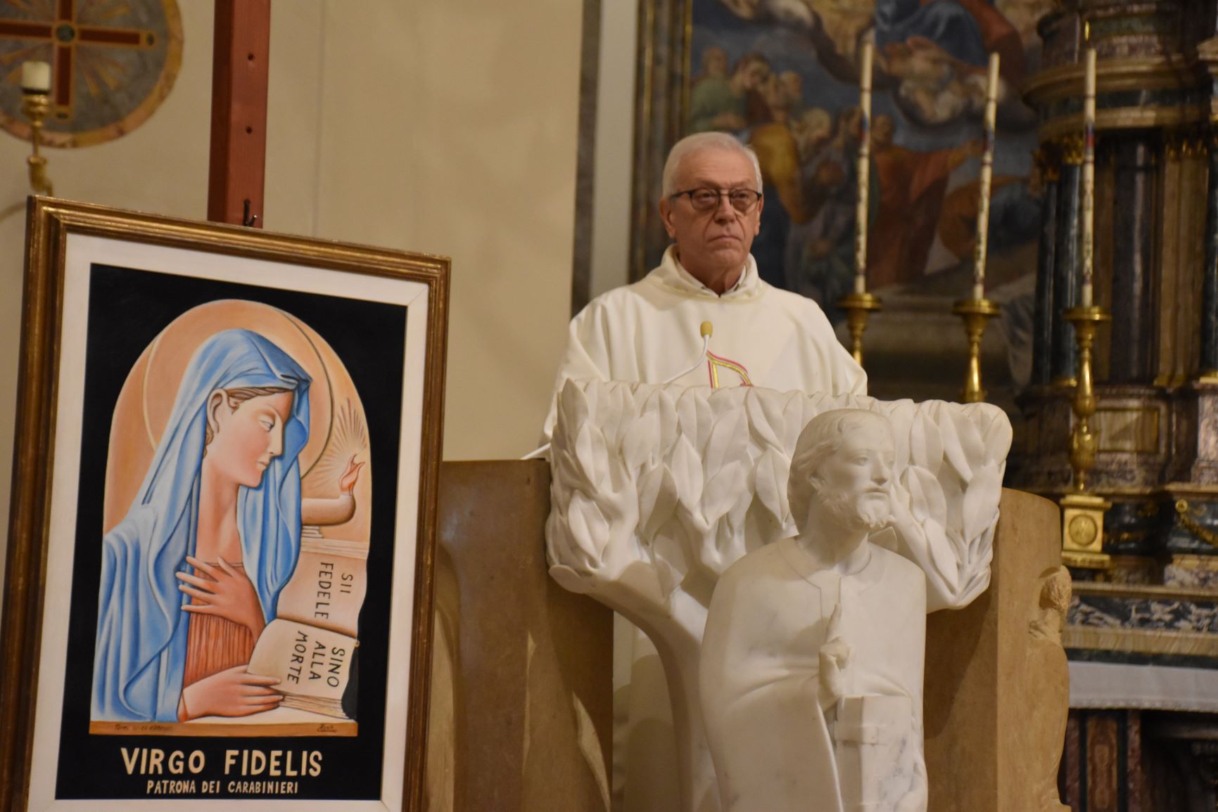 La festa della patrona dell’Arma dei Carabinieri, celebra l’affidamento dell’Arma alla Madonna “Virgo Fidelis”, ispirata alla fedeltà che è caratteristica dell’Arma dei Carabinieri, che ha per motto “Nei secoli fedele”, ha ricordato il vescovo Soddu: “Accostando il vostro motto con la Santa Vergine, Virgo Fidelis, voi implorate dalla Madre di Dio un singolare ma anche familiare supporto nello svolgimento del vostro compito a servizio della collettività, per la difesa e la tutela dei cittadini, specialmente dei più fragili. Maria è beata, ossia felice della gioia di Dio, perché credendo all’adempimento della parola del Signore è rimasta fedele mediante l’assenso di tutta la sua vita. Guardiamo Maria, Vergine fedele, per essere e continuare ad essere come lei nel mondo pellegrini di speranza. E voi in modo speciale, cari carabinieri, possiate sempre essere fedeli agli impegni che caratterizzano il vostro stato e la vostra divisa, per il bene di ciascuno, nelle varie missioni tutte improntate al perseguimento del giusto ordine e quindi della pace, nella edificazione del bene comune e della civiltà dell’amore”.