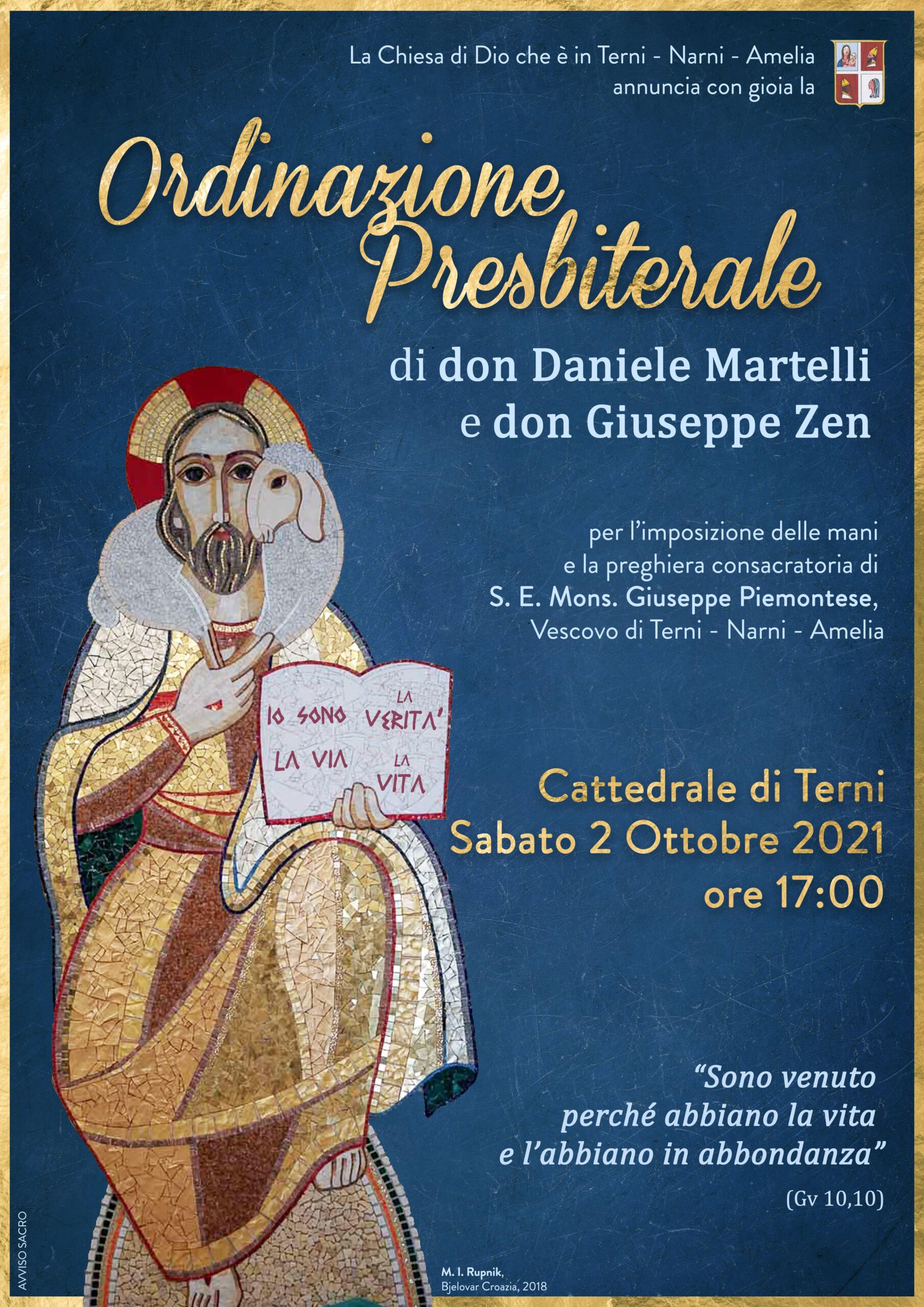 Festa solenne in diocesi per l’ordinazione presbiterale dei diaconi Daniele Martelli e Giuseppe Zen che saranno consacrati nella cattedrale di Terni per imposizione delle mani e la preghiera consacratoria del vescovo Giuseppe Piemontese, sabato 2 ottobre alle ore 17.
