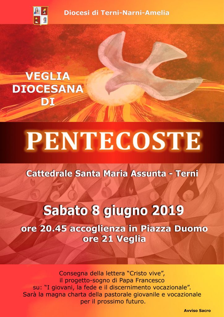 Sabato 8 giugno nella Cattedrale Santa Maria Assunta di Terni, alle ore 20.45, si terrà la veglia di preghiera diocesana per la Pentecoste che sarà presieduta dal vescovo Giuseppe Piemontese. La veglia, che rappresenta un importante momento d’incontro per la chiesa locale e di preghiera comunitaria riunisce in diocesi i vari movimenti ecclesiali, associazioni, parrocchie e i fedeli, in segno di unione e di preghiera comune, perché la Pentecoste sia seme di accoglienza e fraternità, nell’unità tra diversità di carismi e doni a servizio della Chiesa. Una preghiera corale in cui tutto il popolo di Dio si riunisce per invocare lo Spirito Santo sulla Diocesi, sulla Città e sul mondo.