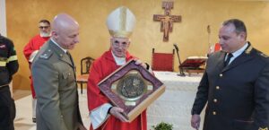 Al termine è stata recitata la preghiera a santa Barbara. Il comandante dei Vigili del Fuoco di Terni ha ricordato l’attività svolta nell’anno trascorso e ringraziato tutto il personale per l’impegno e la professionalità. Insieme a comandante del Polo Mantenimento Armi Leggere generale Francesco Nasca, hanno poi donato al vescovo Soddu, un bassorilievo in metallo raffigurante santa Barbara realizzato dalle maestranze del Pmal.