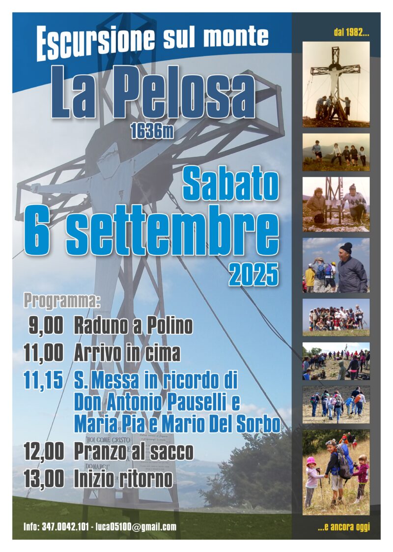 Tradizionale escursione sul Monte La Pelosa sabato 6 settembre, organizzata in memoria di don Antonio Pauselli e dei coniugi Maria Pia e Mario Del Sorbo: persone legate da una forte amicizia e dalla passione per la montagna che hanno contribuito alla ideazione, costruzione e installazione della croce posta in cima. L’appuntamento è alle 9 sulla piazza di Polino per poi fare qualche passo insieme e celebrare la S.Messa alle ore 11.15 sulla cima della Pelosa, ai piedi della croce.