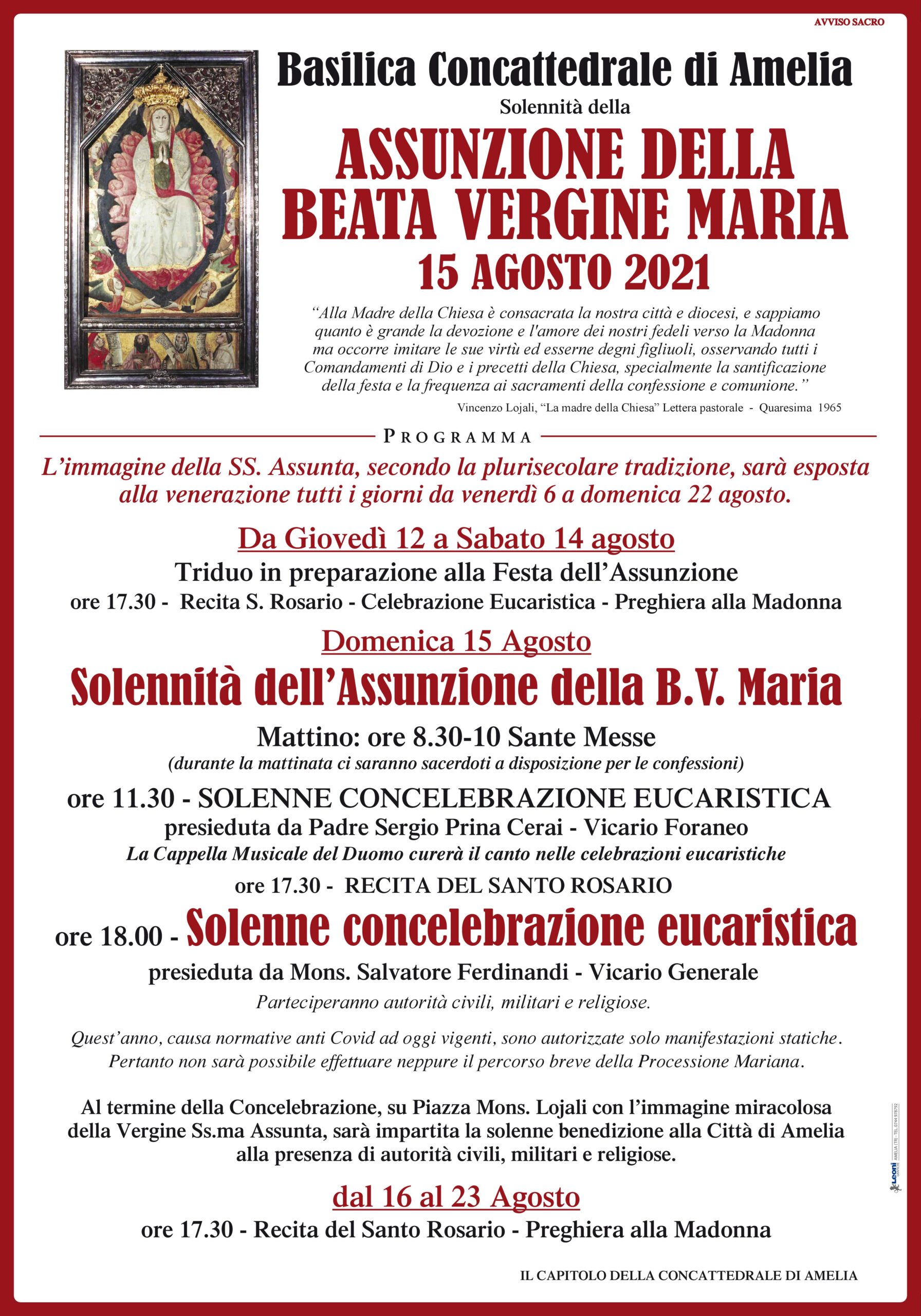 Domenica 15 agosto si terrà una solenne concelebrazione alle ore 11.30 presieduta da da padre Sergio Prina Cerai vicario foraneo di Amelia e Valle Teverina, animata dalla cappella musicale del Duomo. Alle ore 18.00 la solenne concelebrazione eucaristica presieduta da mons. Salvatore Ferdinandi vicario generale della diocesi. Al termine della Concelebrazione, su piazza Mons. Lojali con l’immagine miracolosa della Vergine Ss.ma Assunta, sarà impartita la solenne benedizione alla Città di Amelia alla presenza di autorità civili, militari e religiose