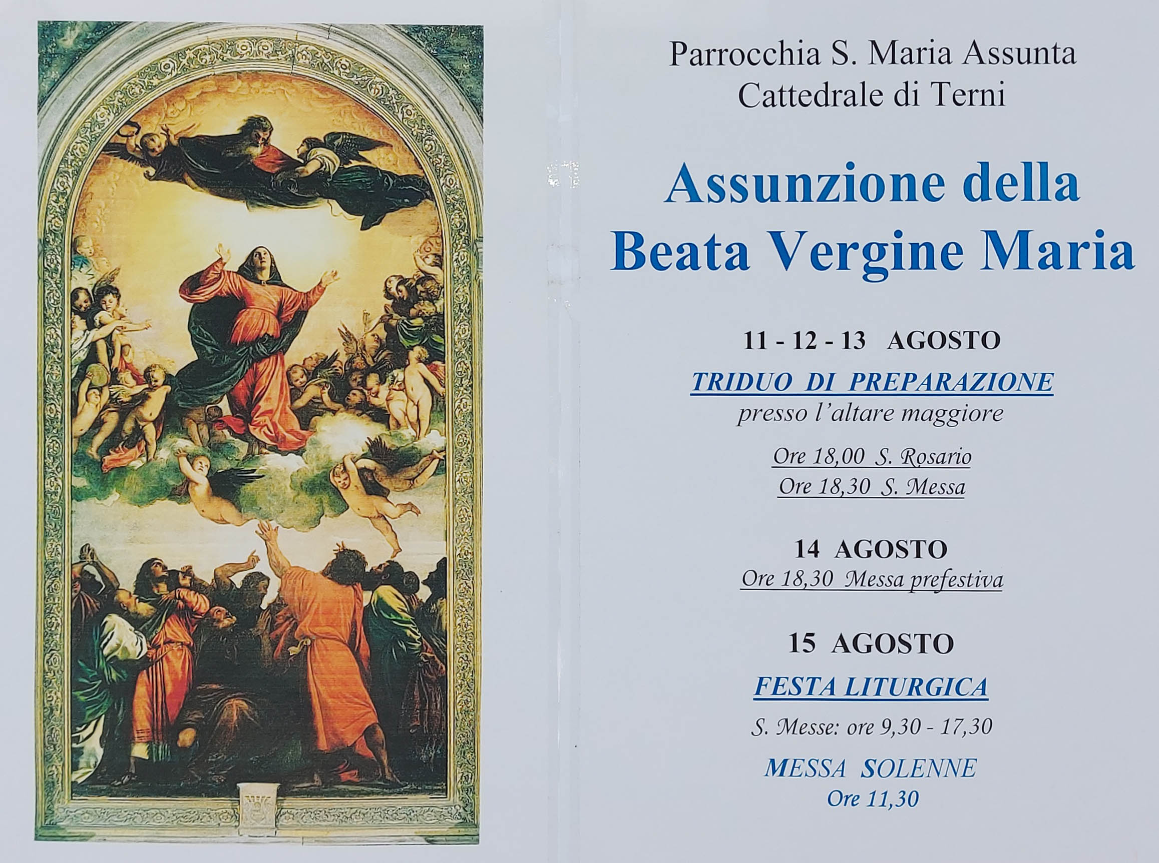 Nella cattedrale di Santa Maria Assunta di Terni l’11-12-13 agosto si terrà il triduo di preparazione alla festa con la recita del rosario alle ore 18.00 e la Messa alle 18.30 presso l’altare maggiore.
