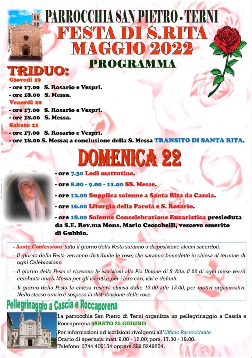 Domenica 22 maggio saranno celebrate le sante messe alle ore 8 – 9 e alle 11. Alle ore 12 Supplica solenne a Santa Rita da Cascia – Alle ore 18.00 Solenne Concelebrazione Eucaristica presieduta da Mons. Mario Ceccobelli vescovo emerito dí Gubbio.