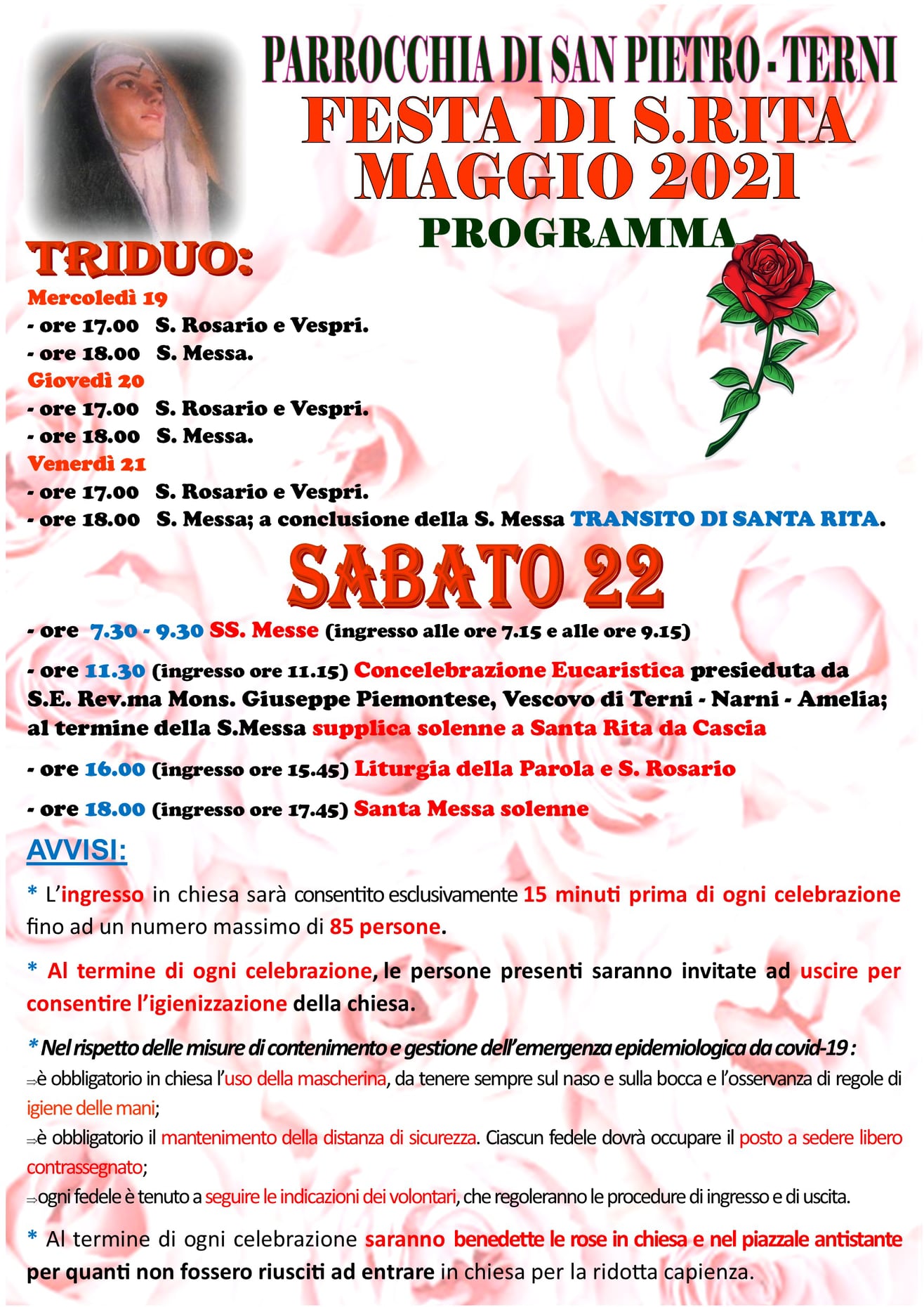 La celebrazione delle ore 11.30 presieduta dal vescovo della diocesi di Terni Narni Amelia, mons. Giuseppe Piemontese e la supplica a Santa Rita da Cascia, sarà trasmessa in diretta sulla pagina Facebook della diocesi di Terni Narni Amelia, su quella della parrocchia di San Pietro e sul canale Youtube della diocesi di TerniNarniAmelia, per consentire alle tante persone devote della Santa di seguire la celebrazione e il rito della benedizione delle rose, distribuite all’interno della chiesa.