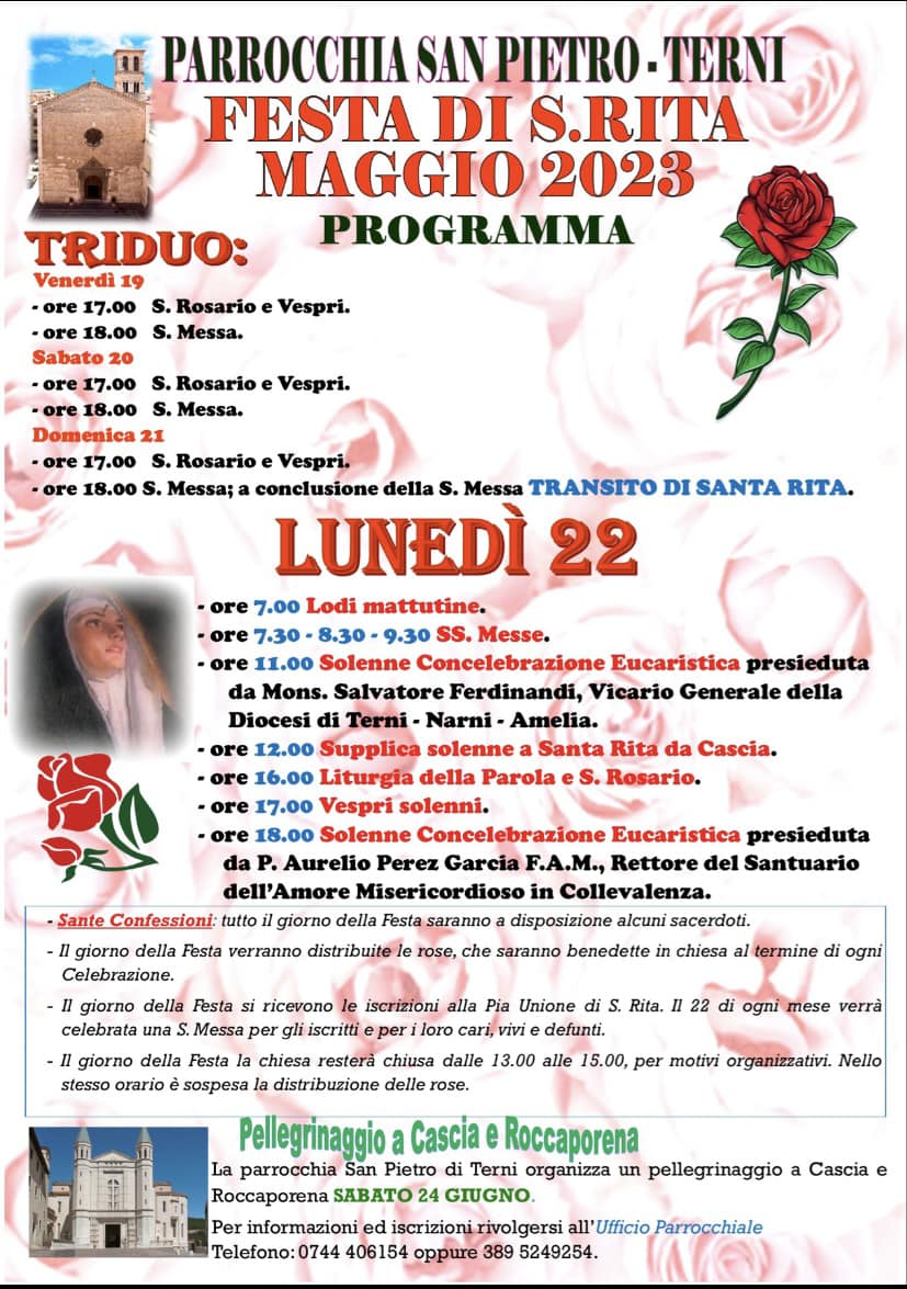 Lunedì 22 maggio saranno celebrate le sante messe alle ore 7.30 – 8.30 – 9.30 e alle 11 Solenne Concelebrazione Eucaristica presieduta da Mons. Salvatore Ferdinandi vicario generale della Diocesi. Alle ore 12 Supplica solenne a Santa Rita da Cascia – Alle ore 18.00 Solenne Concelebrazione Eucaristica presieduta da padre Aurelio Perez Garcia rettore del santuario dell’Amore Misericordioso di Collevalenza.