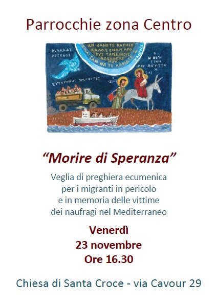In occasione della visita all’unità pastorale Terni centro, venerdì 23 novembre alle 16.30 nella chiesa di Santa Croce si terrà la veglia di preghiera ecumenica per i migranti e in memoria delle vittime dei naufragi. Parteciperanno il vescovo Piemontese, il prete ortodosso romeno, il pastore valdese metodista  e il pastore pentacostale nigeriano.