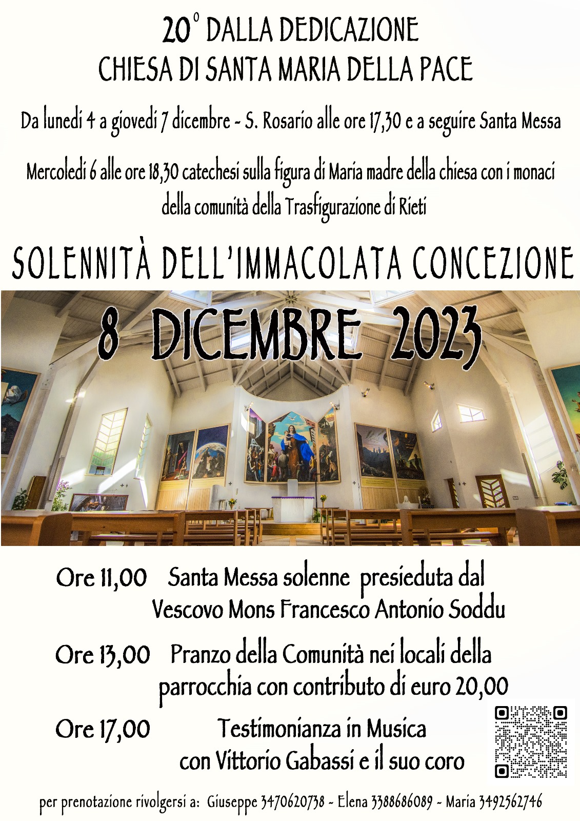 L’8 dicembre 2023 ricorre il 20° anniversario della dedicazione della chiesa di Santa Maria della Pace a Valenza che è stato celebrato alle ore 11 con la solenne messa presieduta dal vescovo Francesco Antonio Soddu e concelebrata dal parroco don Tiziano Presezzi. A seguire il pranzo della comunità nei locali della parrocchia e nel pomeriggio la testimonianza in musica con Vittorio Gabassi e il suo coro.
