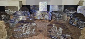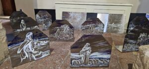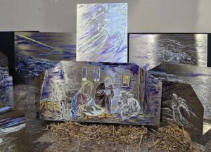 La presente opera è realizzata su lamierino di acciaio inox da Ferri Giovanni, pittore e collega di lavoro di Massimo Cascioli. Riprodotto in misure più grandi, riprendendo immagini di alcuni suoi personaggi presenti nelle foto di quel presepio, purtroppo andato totalmente perduto, e completando l’opera con l’aggiunta di altri