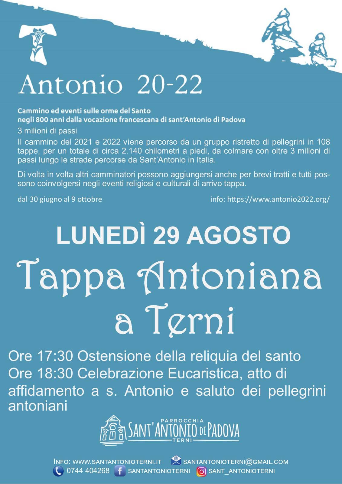 Nell’ambito degli eventi sulle orme di sant’Antonio di Padova negli 800 anni dalla vocazione francescana, lunedì 29 agosto presso la chiesa di Sant’Antonio a Terni si terrà la tappa antoniana del cammino 2021 e 2022 “tre milioni di passi”, percorso da un gruppo ristretto di pellegrini in 108 tappe, per un totale di circa 2.140 chilometri a piedi, da colmare con oltre 3 milioni di passi lungo le strade percorse da Sant’Antonio in Italia.
