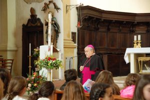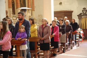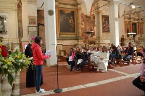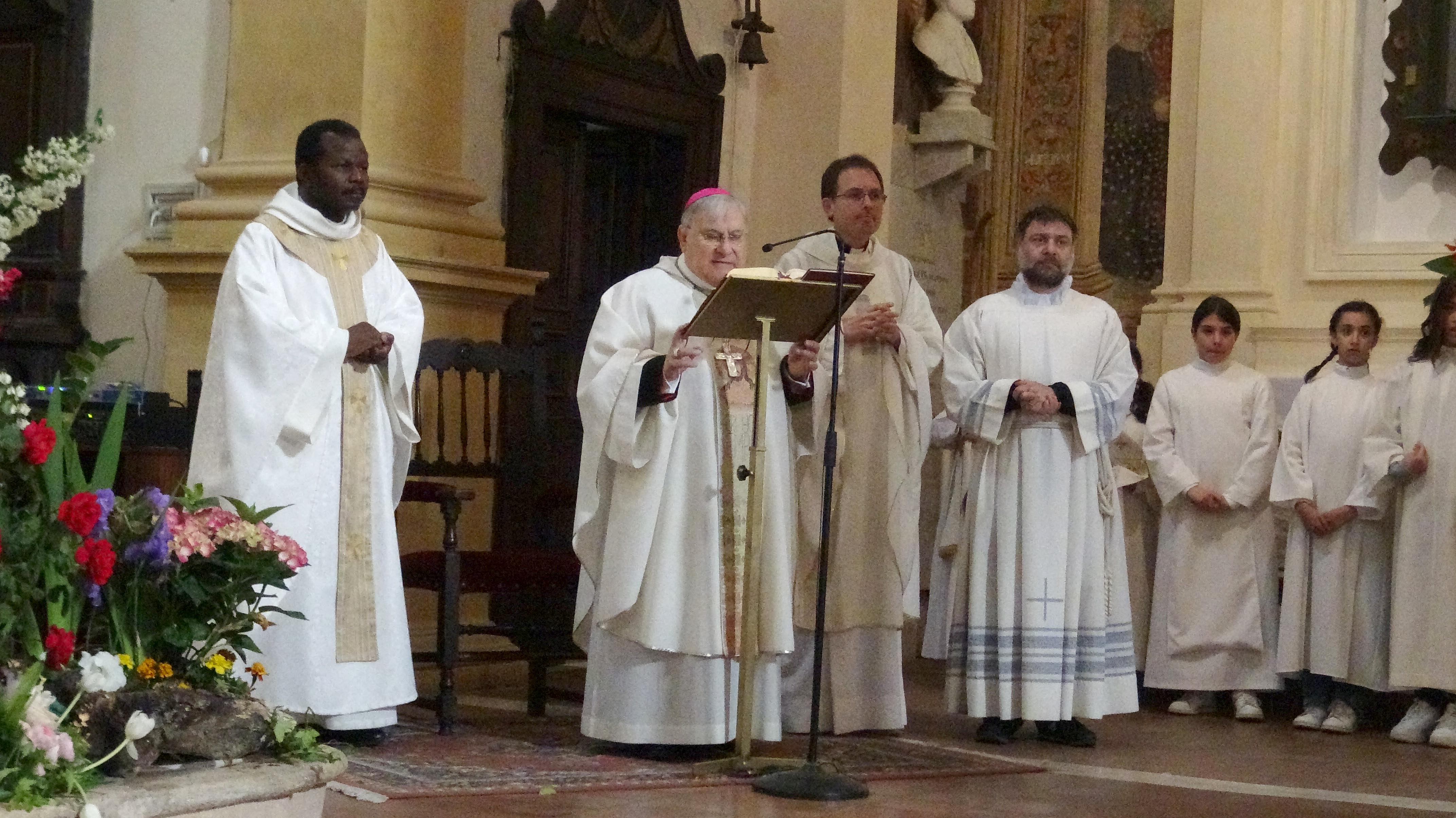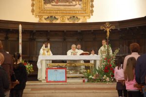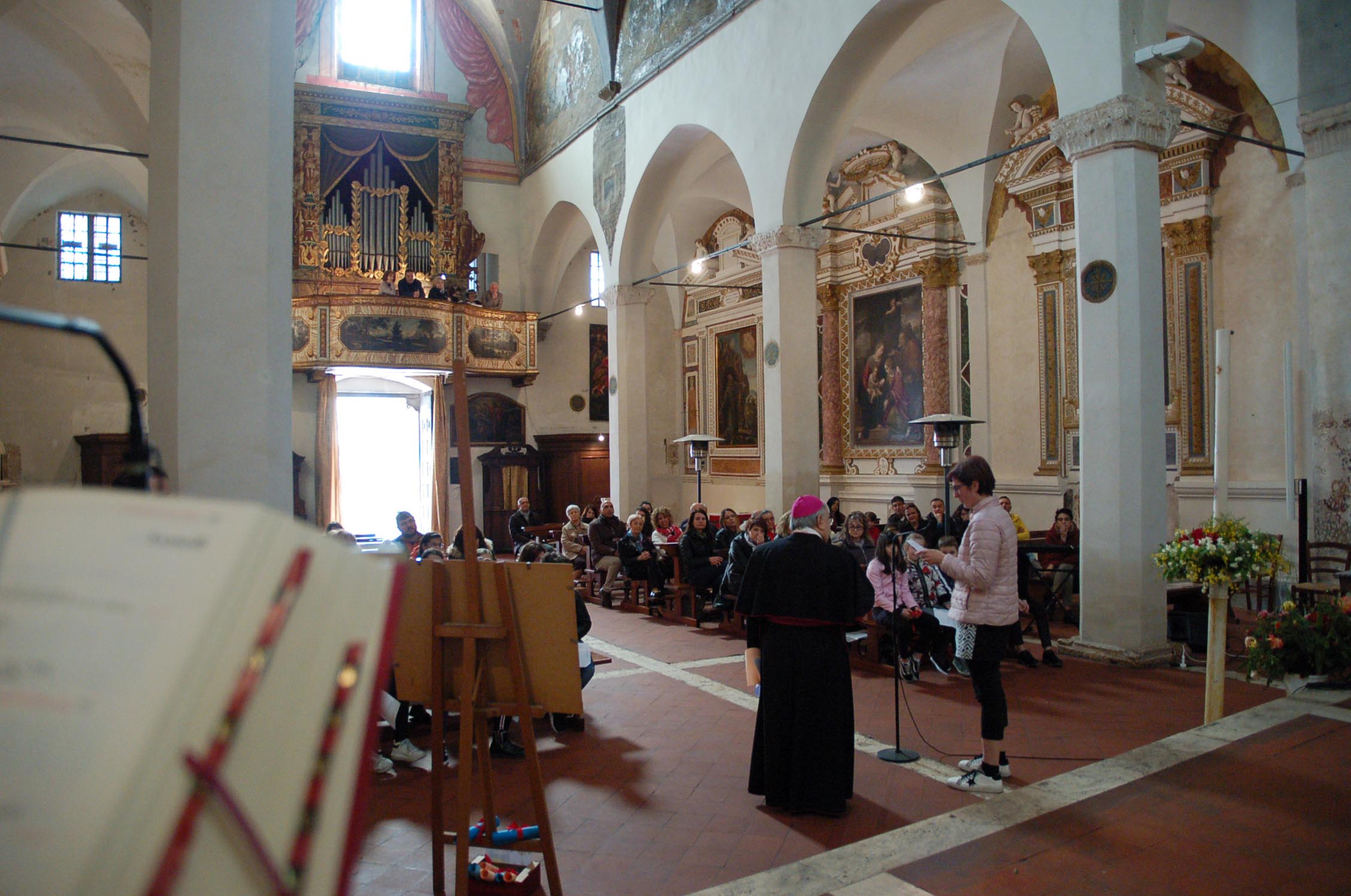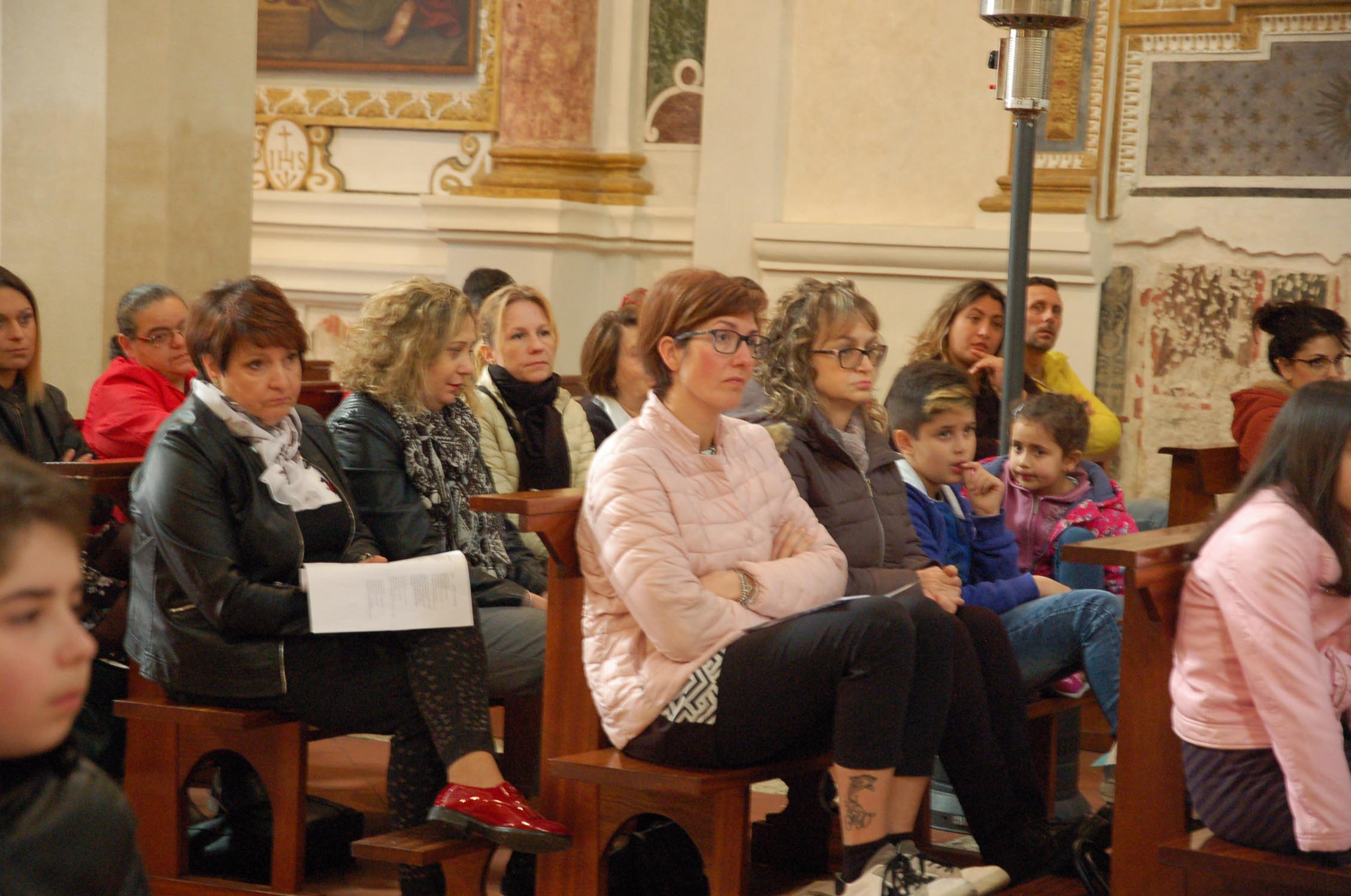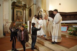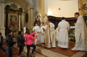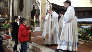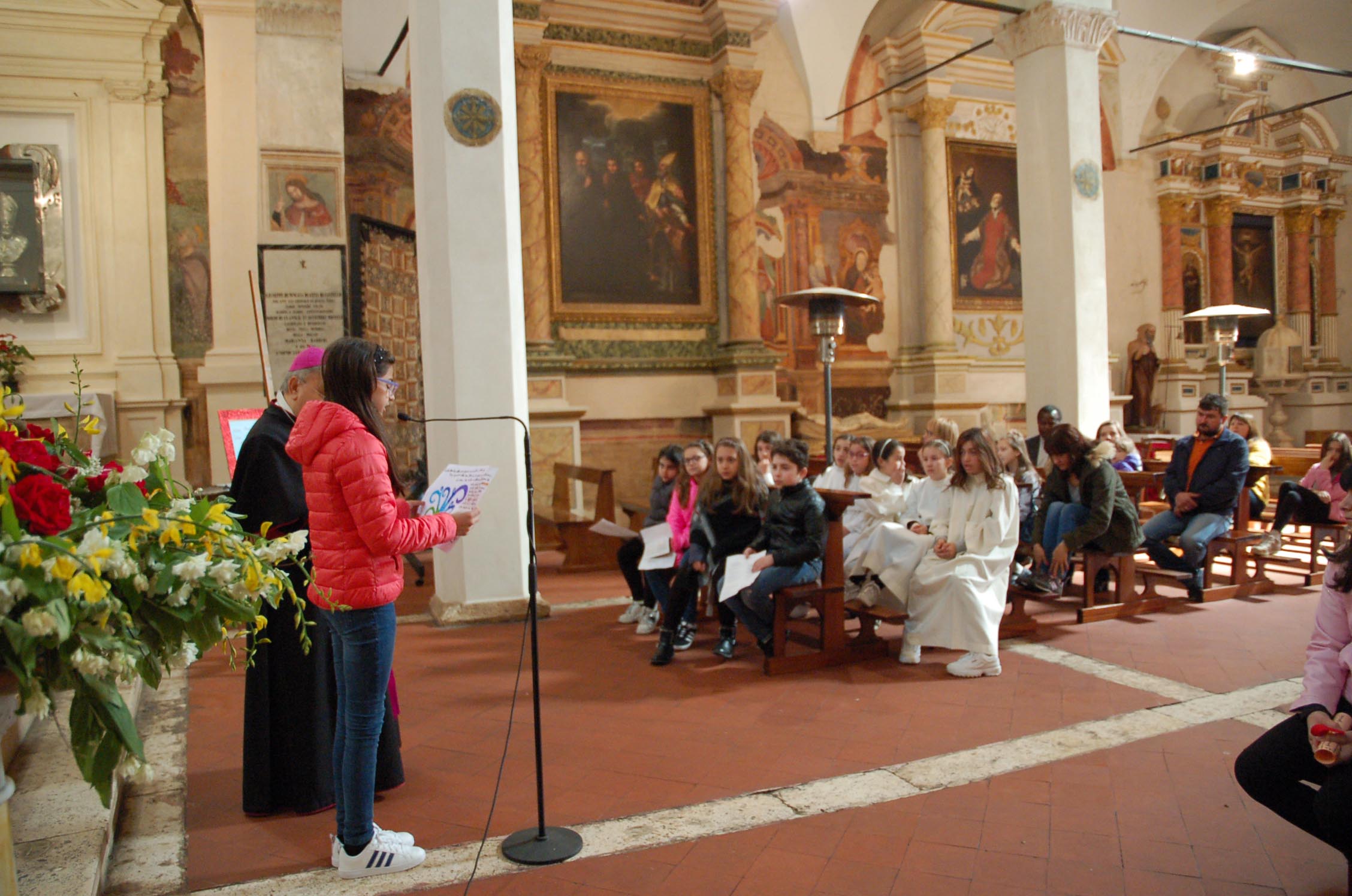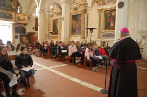 Prima della celebrazione il vescovo ha incontrato i ragazzi dell’iniziazione cristiana, circa 25, i catechisti e i genitori dei bambini, che hanno salutato il vescovo presentando le loro rispettive realtà di vita cristiana. Il vescovo ha ricordato ai genitori l’importanza di vivere un cammino di fede continuo e comune in famiglia, di non fermarsi ad una formazione che sia limitata alla preparazione ai sacramenti, ma che sia un percorso di vita cristiana, che porti sempre più ad amare il Signore e trovare consolazione e forza nella fede, in ogni età della vita.