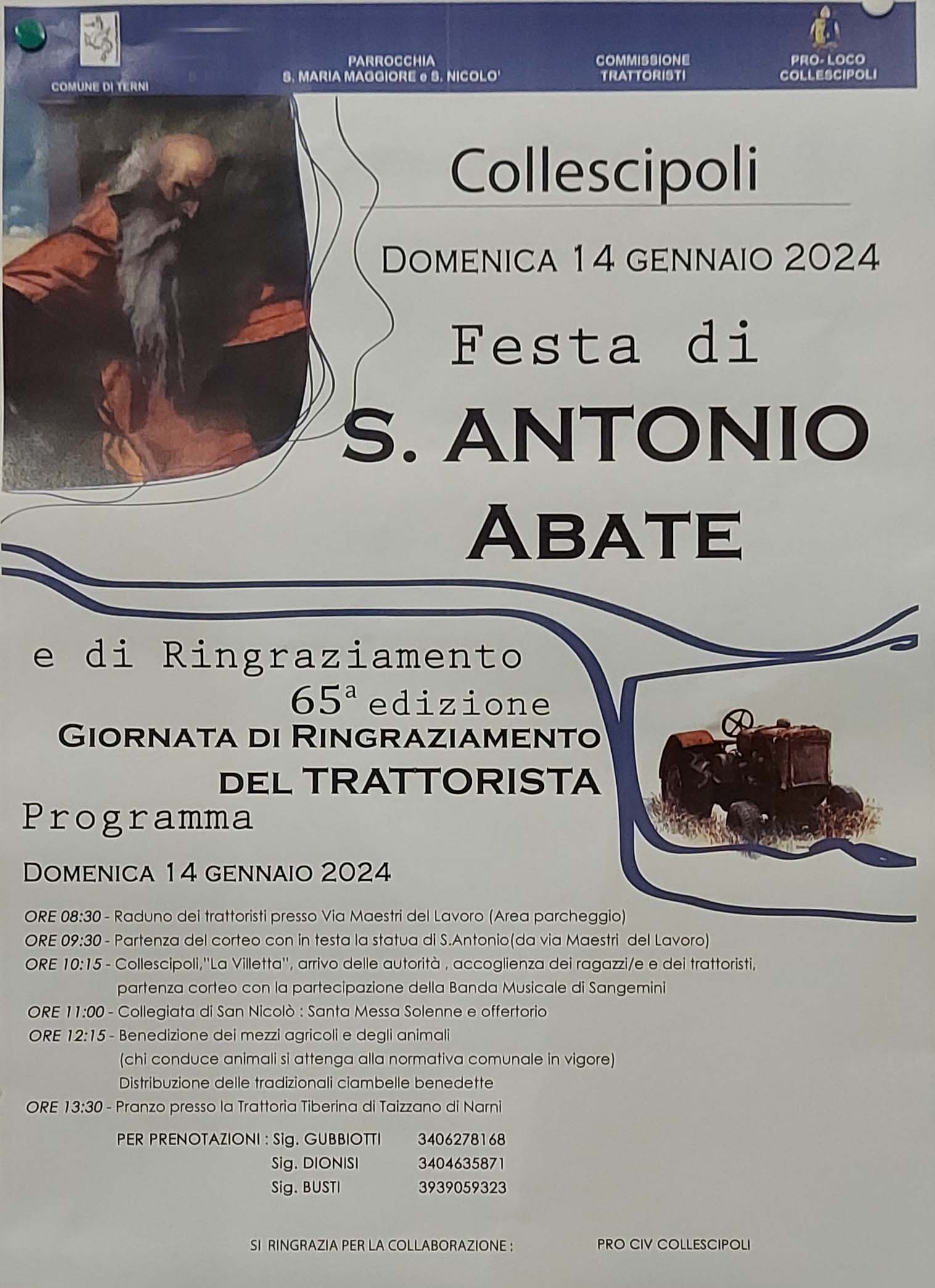 Domenica 14 gennaio a Collescipoli si celebra sant’Antonio abate con la tradizionale giornata del ringraziamento del trattorista e con la benedizione degli animali.