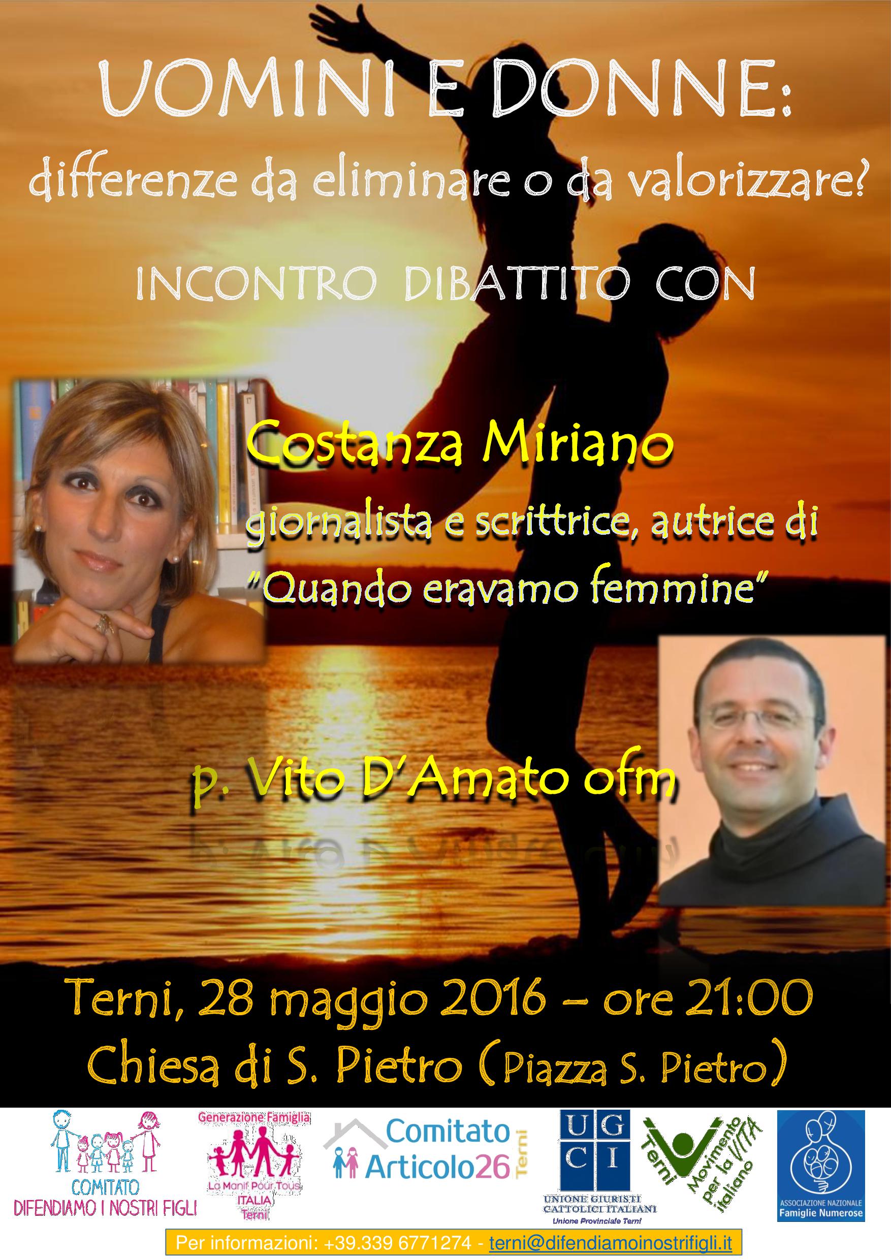Il comitato “Difendiamo i nostri figli” di Terni, che raggruppa diverse realtà presenti sul territorio impegnate nella difesa della famiglia e dei bambini (La Manif Pour Tous, Comitato art. 26, Movimento per la Vita, Associazione Nazionale Famiglie Numerose) ha organizzato per il 28 maggio alle ore 21 presso la chiesa di San Pietro di Terni, un incontro con la cittadinanza dal titolo “Uomini e donne: differenze da eliminare o da valorizzare?”. Interverrà la giornalista e scrittrice Costanza Miriano ed al frate francescano padre Vito D’Amato ofm per affrontare il tema dell’importanza delle differenze tra uomo e donna e della famiglia come luogo in cui queste diversità, fondendosi e completandosi, generano la vita.