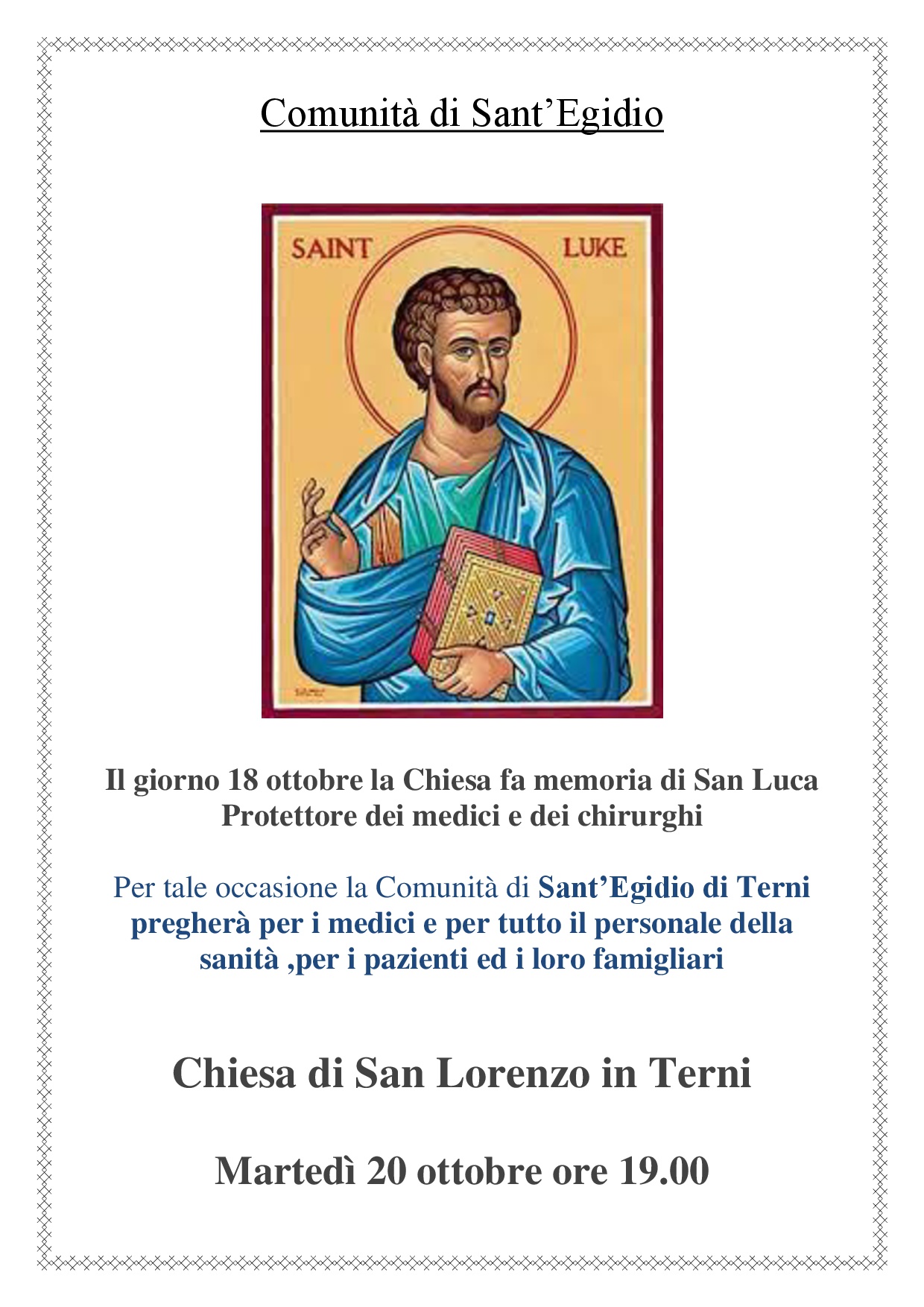 Eventi 16 Ottobre 2020 Comnità di sant’Egidio – preghiera per i medici e per il personale sanitario Martedì 20 ottobre alle ore 19 nella chiesa di San Lorenzo, preghiera in prossimità della festa di san Luca, protettore dei medici e dei chirurghi. Preghiera San Luca 20 ottobre 2020