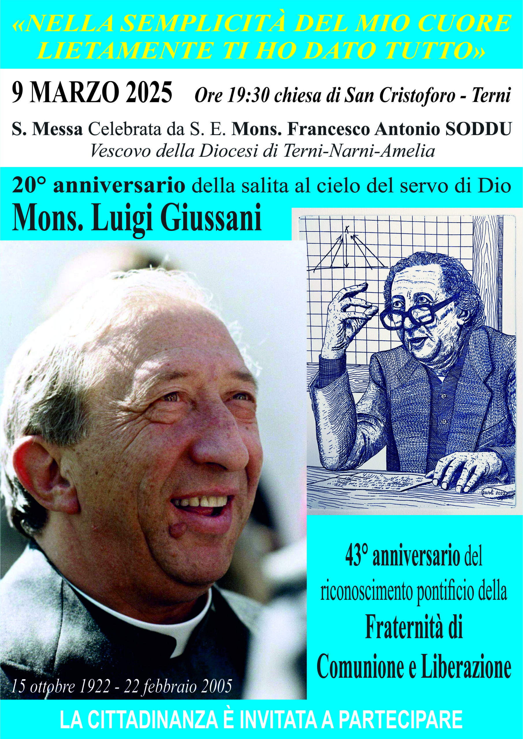 Domenica 9 marzo alle ore 19.30 nella Chiesa di San Cristoforo a Terni, il Vescovo della Diocesi di Terni-Narni-Amelia mons. Francesco Antonio Soddu celebrerà la Santa messa in occasione del 20° anniversario della salita al Cielo del Servo di Dio don Luigi Giussani (22 febbraio 2005) e del 43° del riconoscimento pontificio della Fraternità di Comunione e Liberazione (11 febbraio 1982).