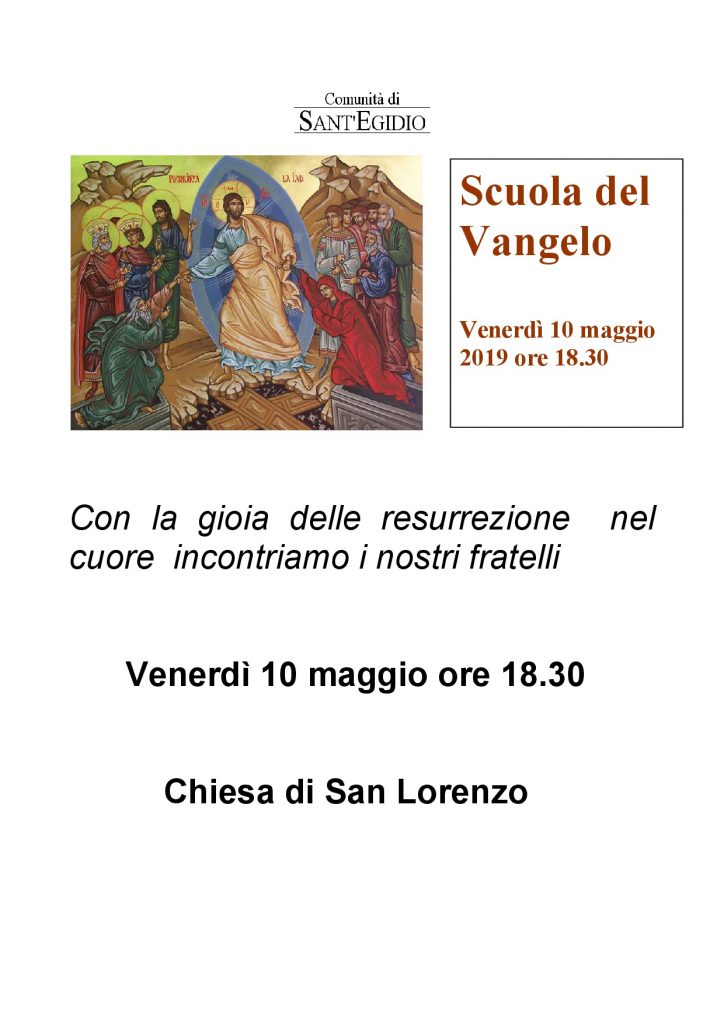 Venerdì 10 maggio ore 18.30 ci sarà una Scuola del Vangelo dopo la Pasqua, presieduta da don Riccardo Mensuali.