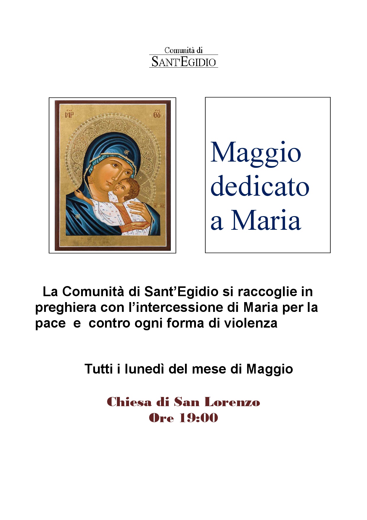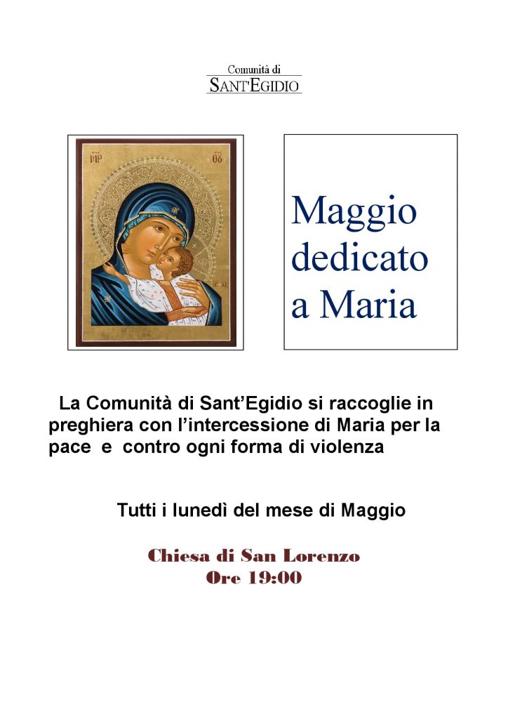 Ogni lunedì alle ore 19, la Comunità di Sant’Egidio si raccoglie in preghiera durante il mese di maggio dedicato a Maria presso la Chiesa di San Lorenzo per la preghiera per la pace e ogni martedì recita del Rosario presso la residenza protetta per anziani di Collerolletta ore 16.00