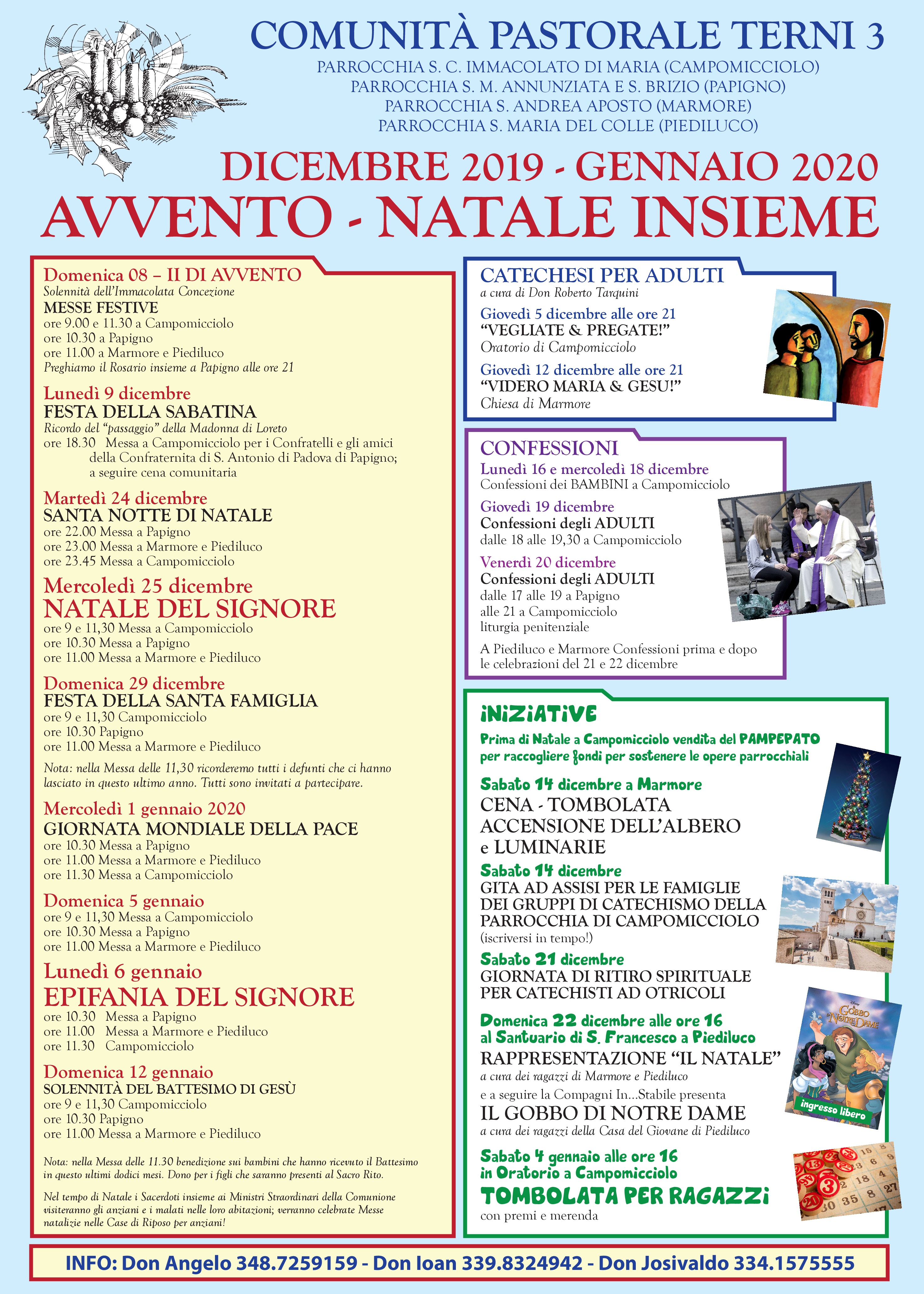 La comunità pastorale Terni 3 comprendente le parrocchie del Sacro Cuore Immacolato di Maria (Campomicciolo), S.M.Annunziata e S.Brizio (Papigno), S.Andrea apostolo (Marmore), parrocchia S.Maria del colle (Piediluco) si prepara al Natale con celebrazioni e manifestazioni comunitarie.