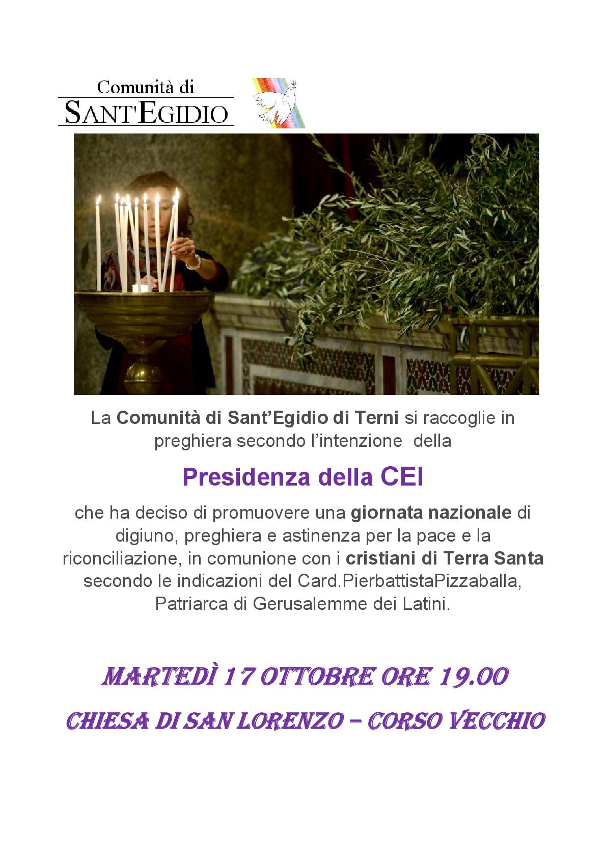 Raccogliendo questo invito a pregare in un momento di grande dolore e forte preoccupazione per l’escalation di violenza in Medio Oriente, la Comunità di Sant’ Egidio di Terni, si raccoglierà in preghiera presso la Chiesa di San Lorenzo a Terni, in Via Tre Archi, il 17 ottobre alle ore 19.