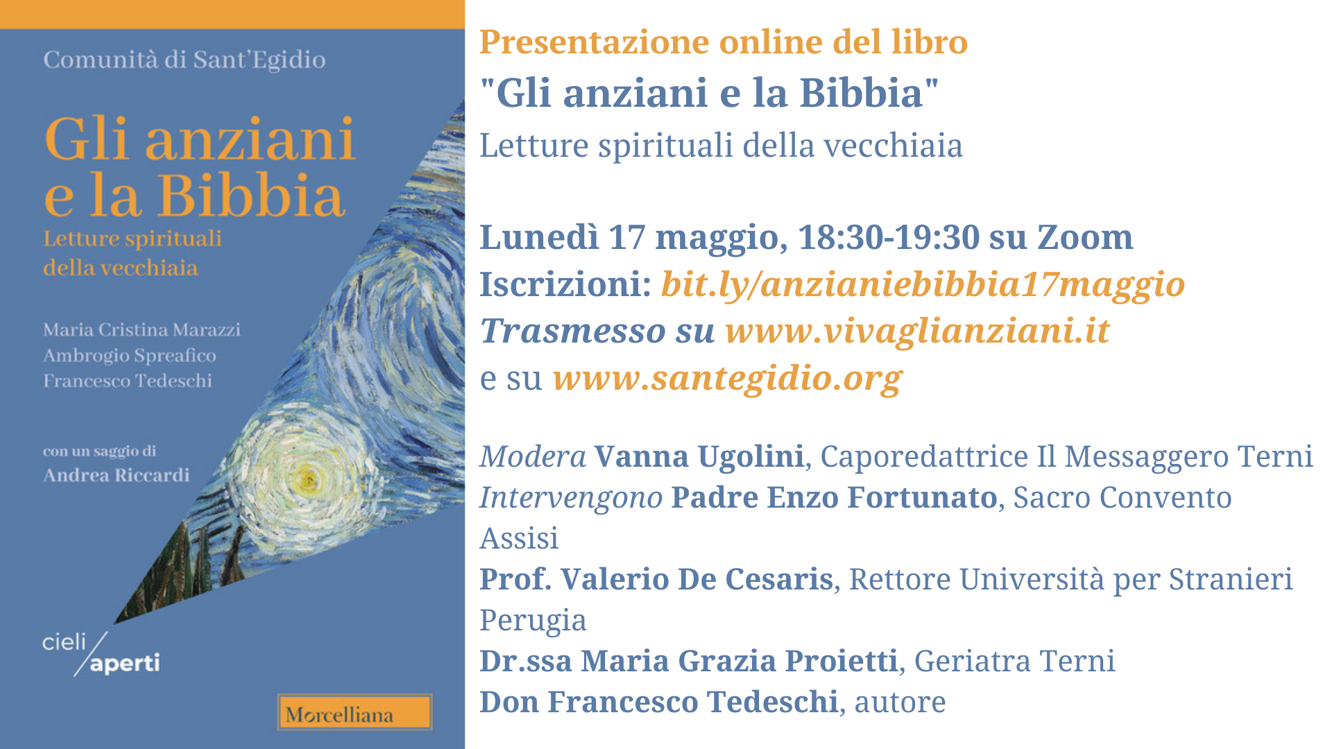 “Gli anziani e la Bibbia. Letture spirituali della vecchiaia” è il libro di Maria Cristina Marazzi, Ambrogio Spreafico, Francesco Tedeschi con un saggio di Andrea Riccardi, edizione Morcelliana che sarà presentato on line lunedì 17 maggio dalle 18:30-19:30 su Zoom Iscrizioni: bit.ly/anzianiebibbia17maggio e che sarà trasmesso sui siti: www.vivaglianziani.it e www.santegidio.org