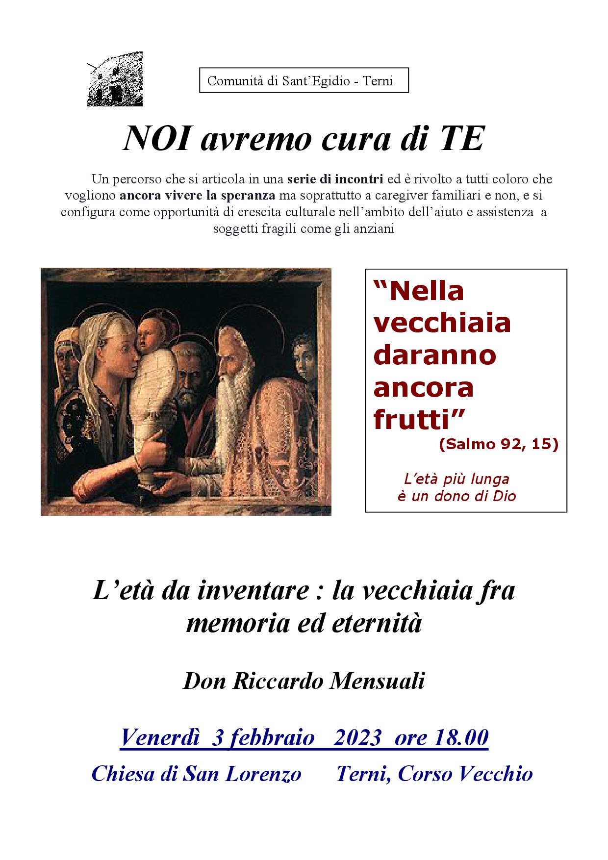Venerdì 3 febbraio ore 18.00 nella chiesa di San Lorenzo a Terni, si parlerà di: ” L’età da inventare: la vecchiaia fra memoria ed eternità ” con l’intervento di don Riccardo Mensuali. L’incontro è parte del ciclo dedicato ad approfondimenti sul prendersi cura di soggetti fragili e anziani. Incontri che sono sono stati molto seguiti e che hanno fatto comprendere come gli anziani e le loro famiglie abbiano bisogno di consolazione, partecipazione ai loro problemi e speranza.