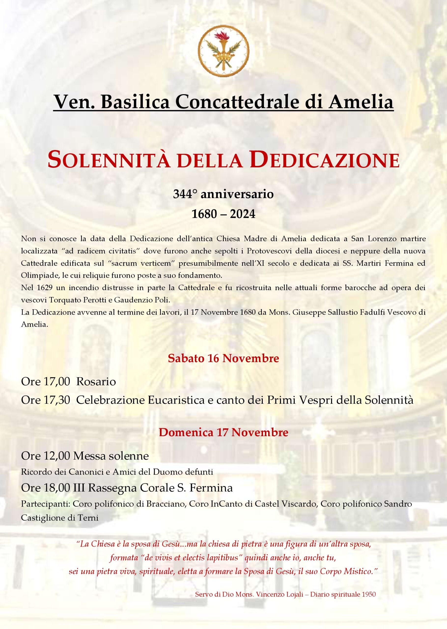 Solenne celebrazione domenica 17 novembre nella Concattedrale di Amelia per il 344° anniversario della sua Dedicazione (1680 -2024).