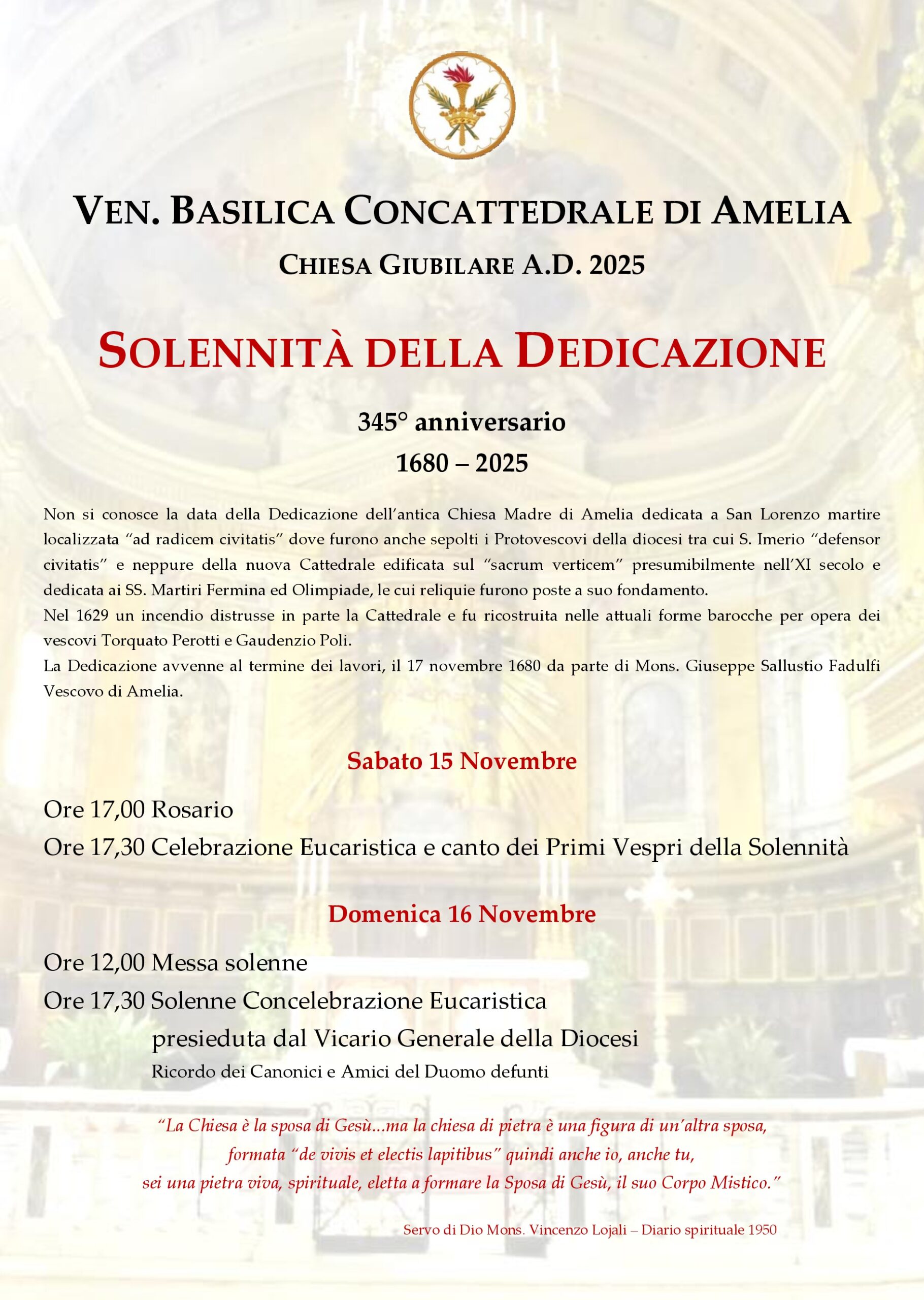 Solenne celebrazione domenica 16 novembre nella Concattedrale di Amelia per il 345° anniversario della sua Dedicazione (1680 -2025).