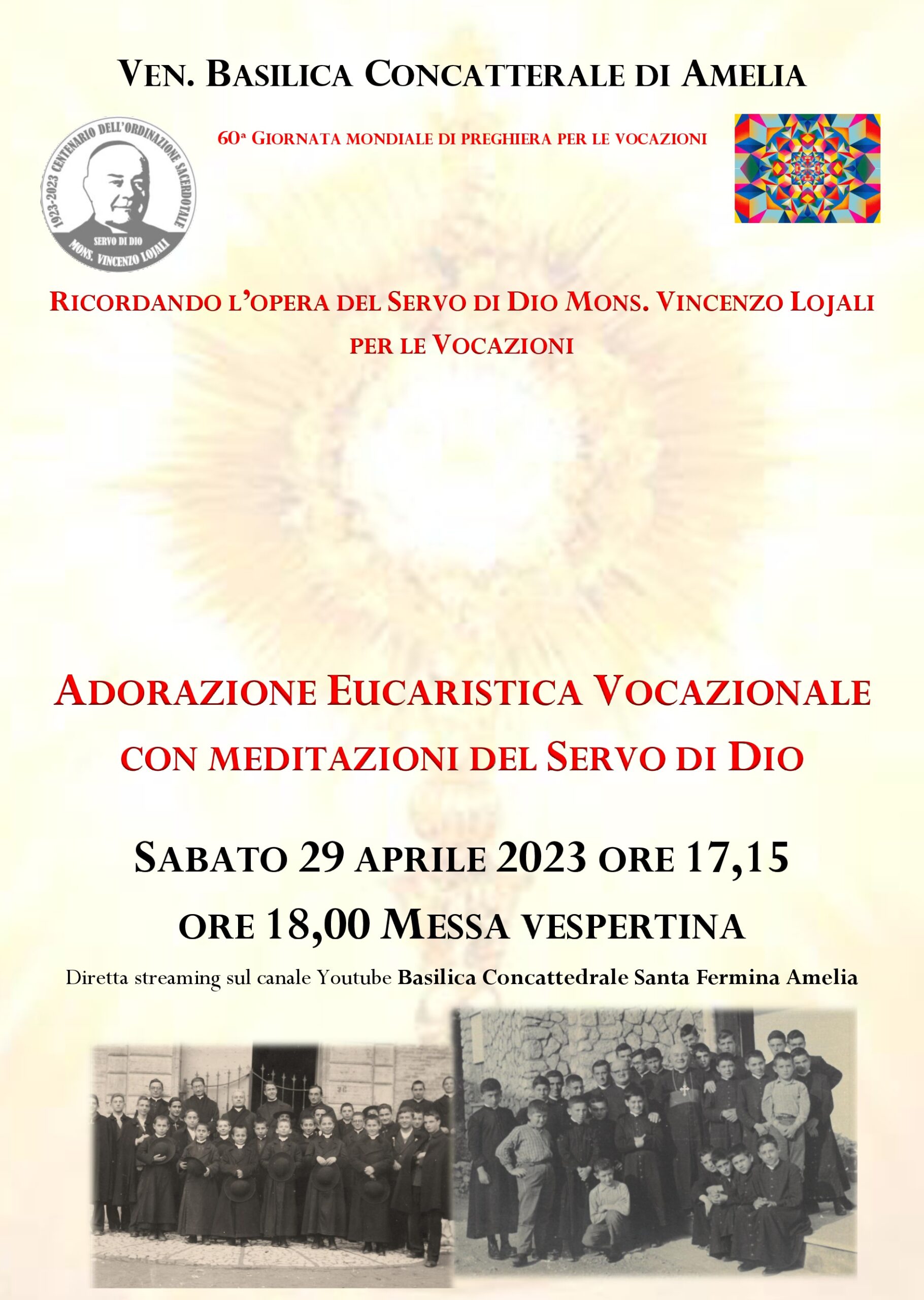 Nella quarta domenica di Pasqua, domenica del Buon Pastore, 60ª Giornata mondiale di preghiera per le Vocazioni in questo anno centenario dell’Ordinazione Sacerdotale del Servo di Dio mons. Vincenzo Lojali la comunità si ritorverà in preghiera presso la sua tomba nella Concattedrale di Amelia dinanzi all’Eucarestia per chiedere al Signore il dono delle Vocazioni, ricordando l’intensa opera del “Vescovo Buono” a favore delle Vocazioni che è stata una tra le priorità del suo ministero di sacerdote e vescovo.