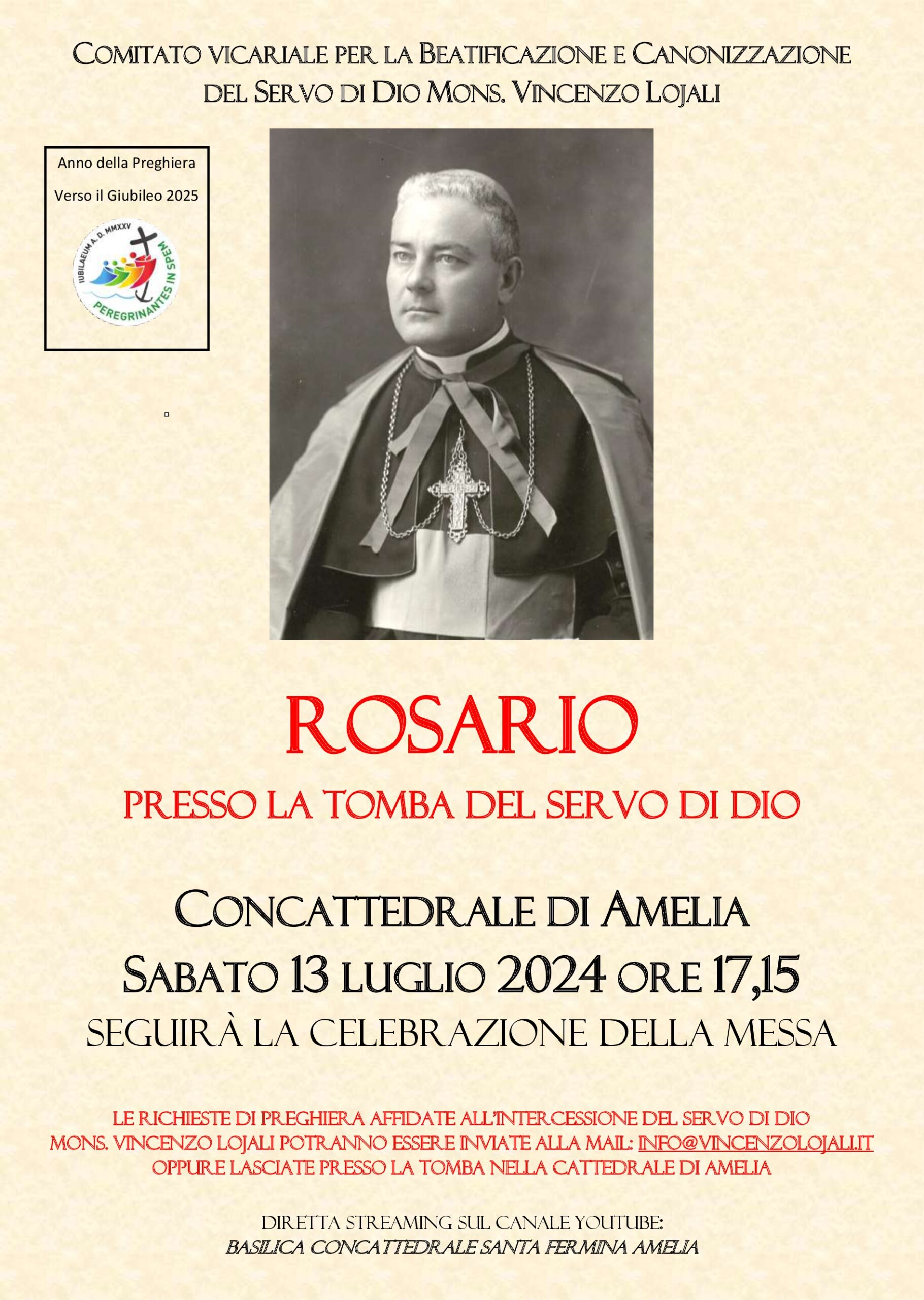 Sabato 13 luglio alle ore 17.15, seguirà la celebrazione della Messa, nell’anno della Preghiera verso il Giubileo 2025. Le richieste di preghiera affidate all’intercessione del Servo di Dio Mons. Vincenzo Lojali potranno essere inviate alla mail: info@vincenzolojali.it oppure lasciate presso la tomba nella Cattedrale di Amelia.