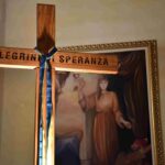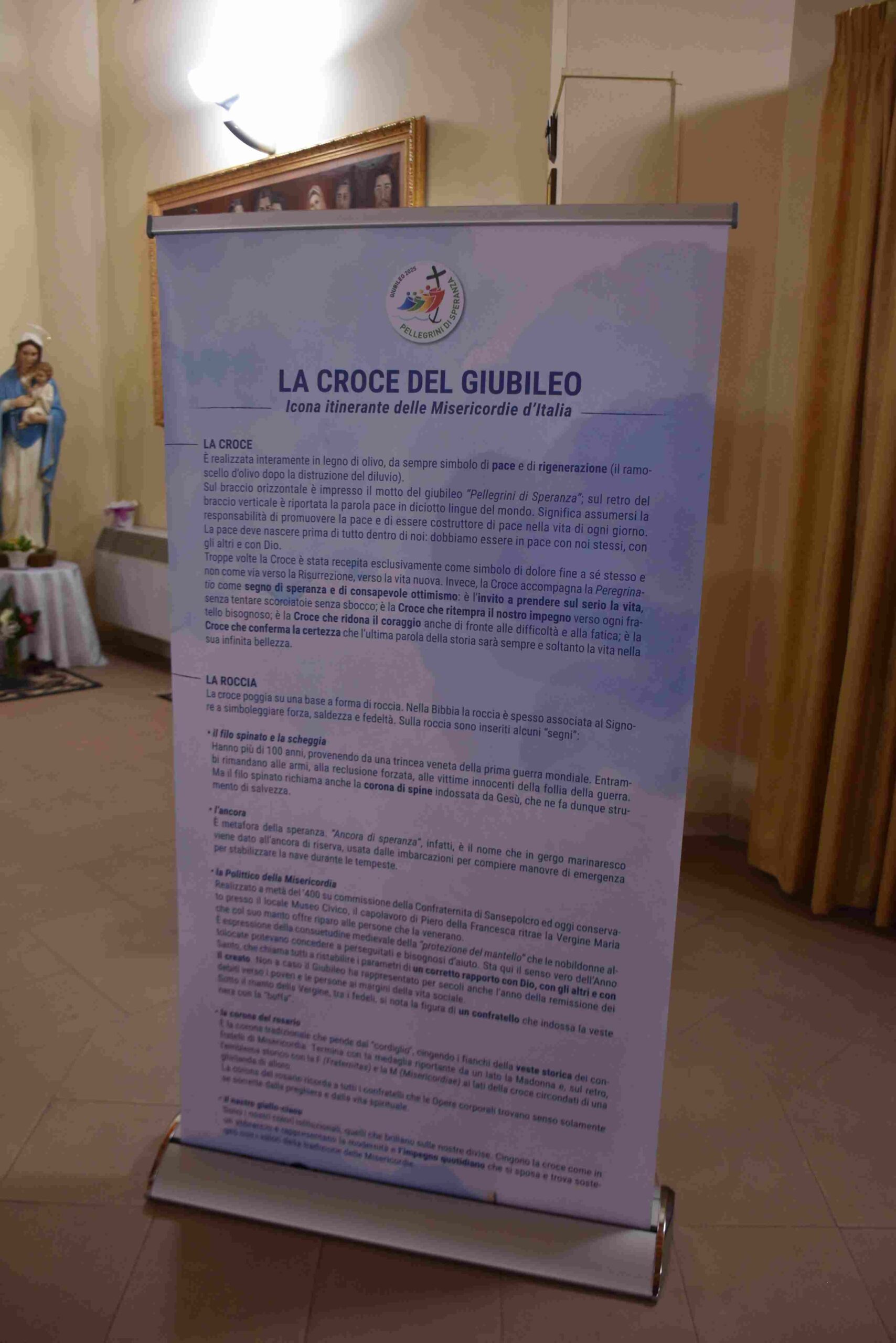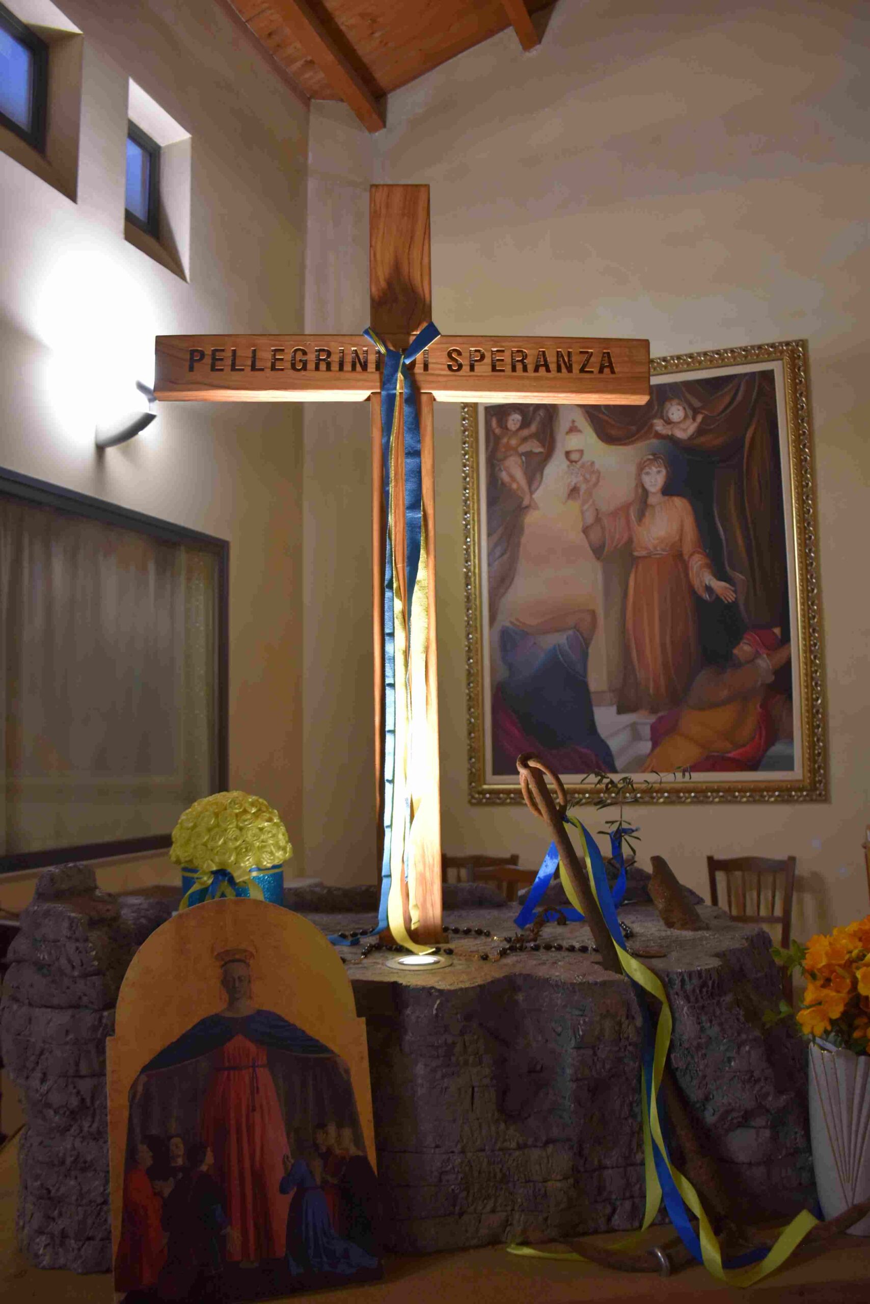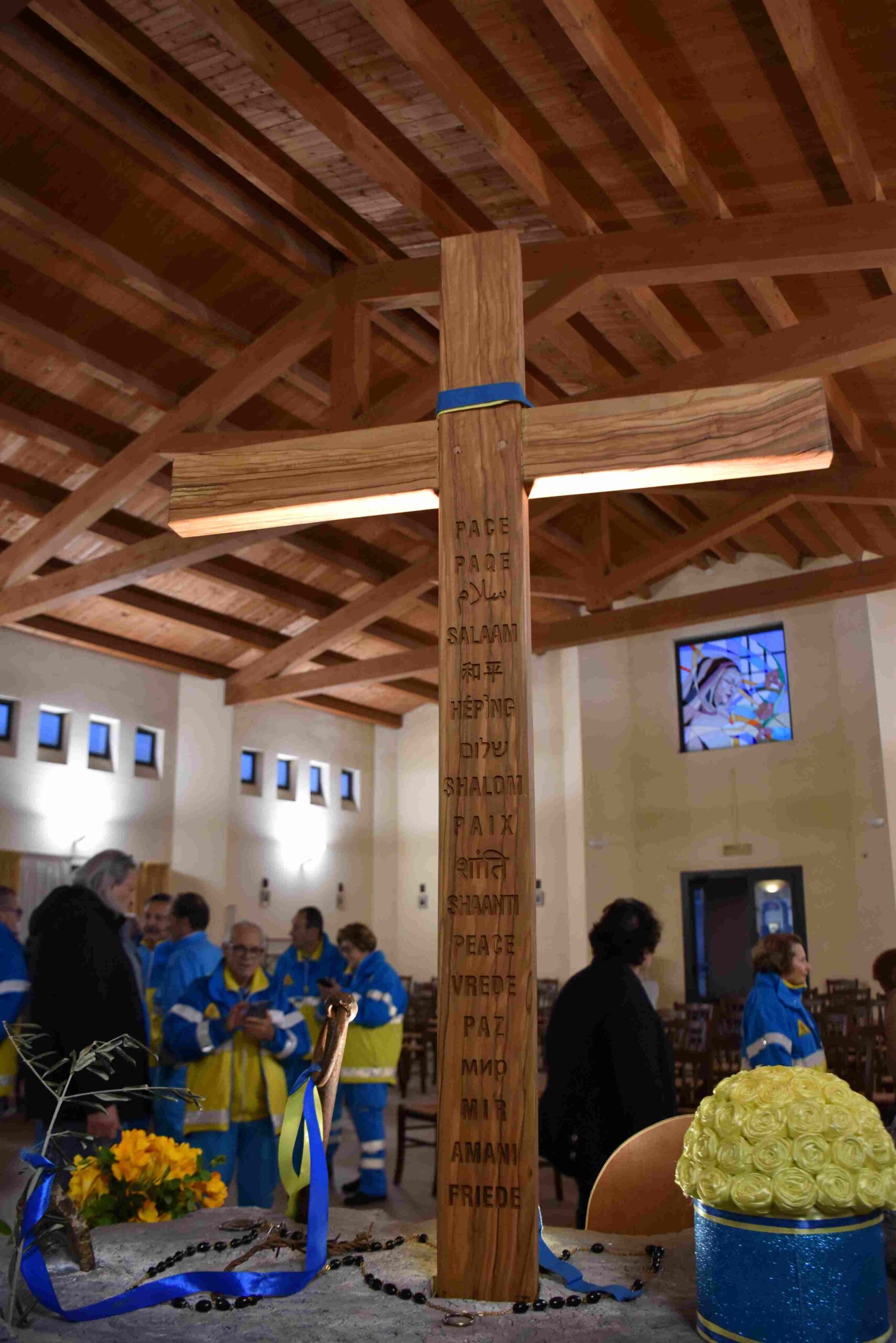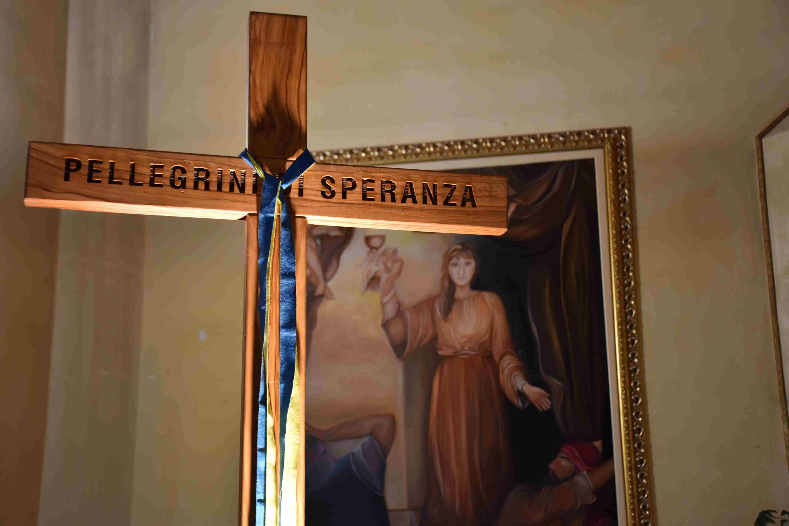 Una croce che insieme all’icona di Maria, alla corona del Rosario esprime la ricerca di pace e di speranza. La croce è realizzata interamente in legno di olivo, ricavata da un tronco di una potatura. L’olivo richiama, nel suo significato, la ricerca di pace da parte dell’uomo. Sulla croce è impressa infatti la parola “pace” in diciotto lingue del mondo, mentre sull’asse orizzontale è contenuto il motto del giubileo “Pellegrini di Speranza”. La Croce poggia su un Golgota che richiama la roccia. Sulla sua sommità destra troviamo una scheggia di guerra e un filo