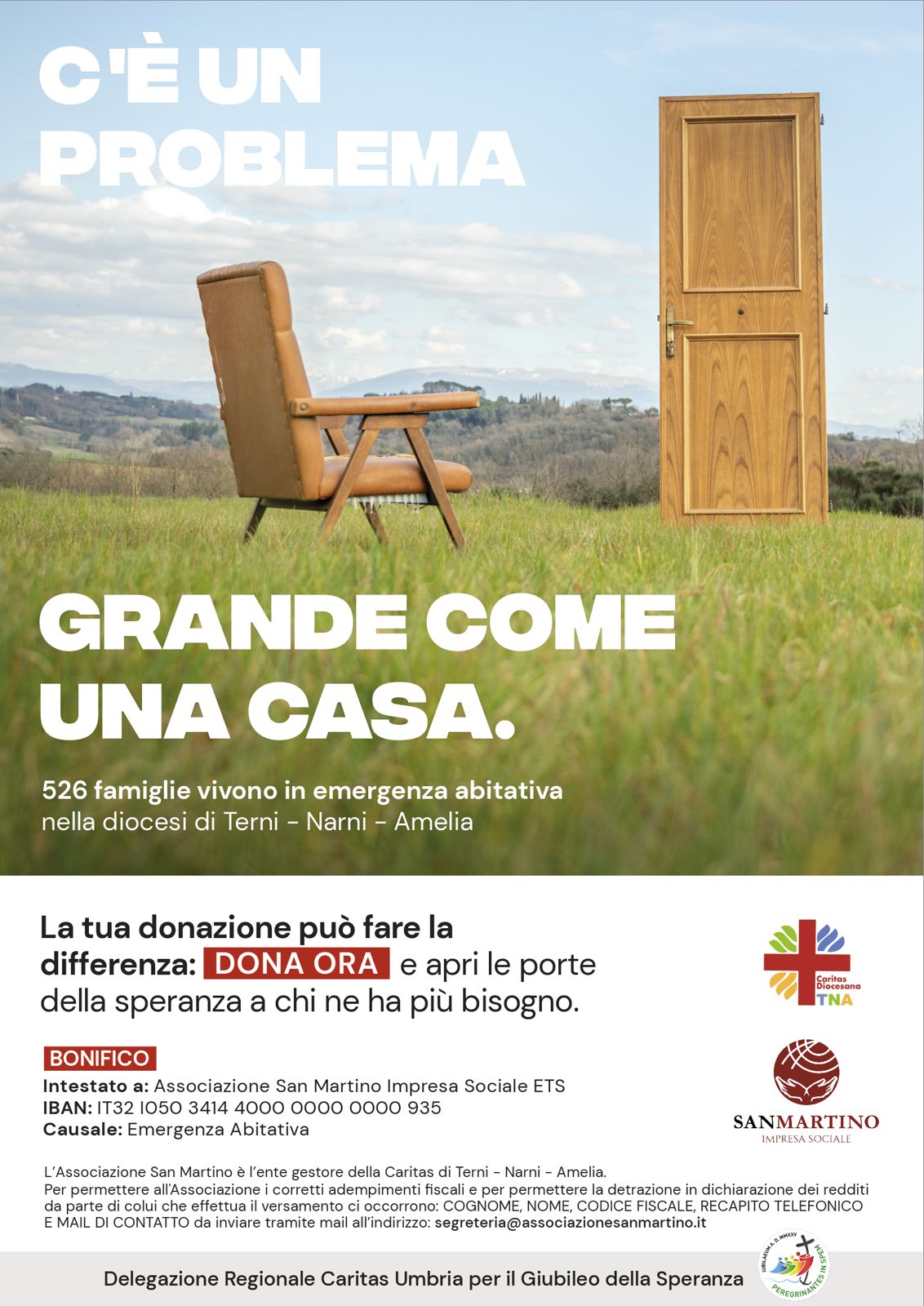 526 famiglie vivono in emergenza abitativa nella diocesi di Terni – Narni – Amelia. Donando in questi mesi apri le porte della speranza a chi ne ha più bisogno o nelle raccolte nelle parrocchie o con Bonifico intestato a: Associazione San Martino Impresa Sociale ETS – IBAN: 1T32 1050 3414 4000 0000 0000 935 Causale: Emergenza Abitativa