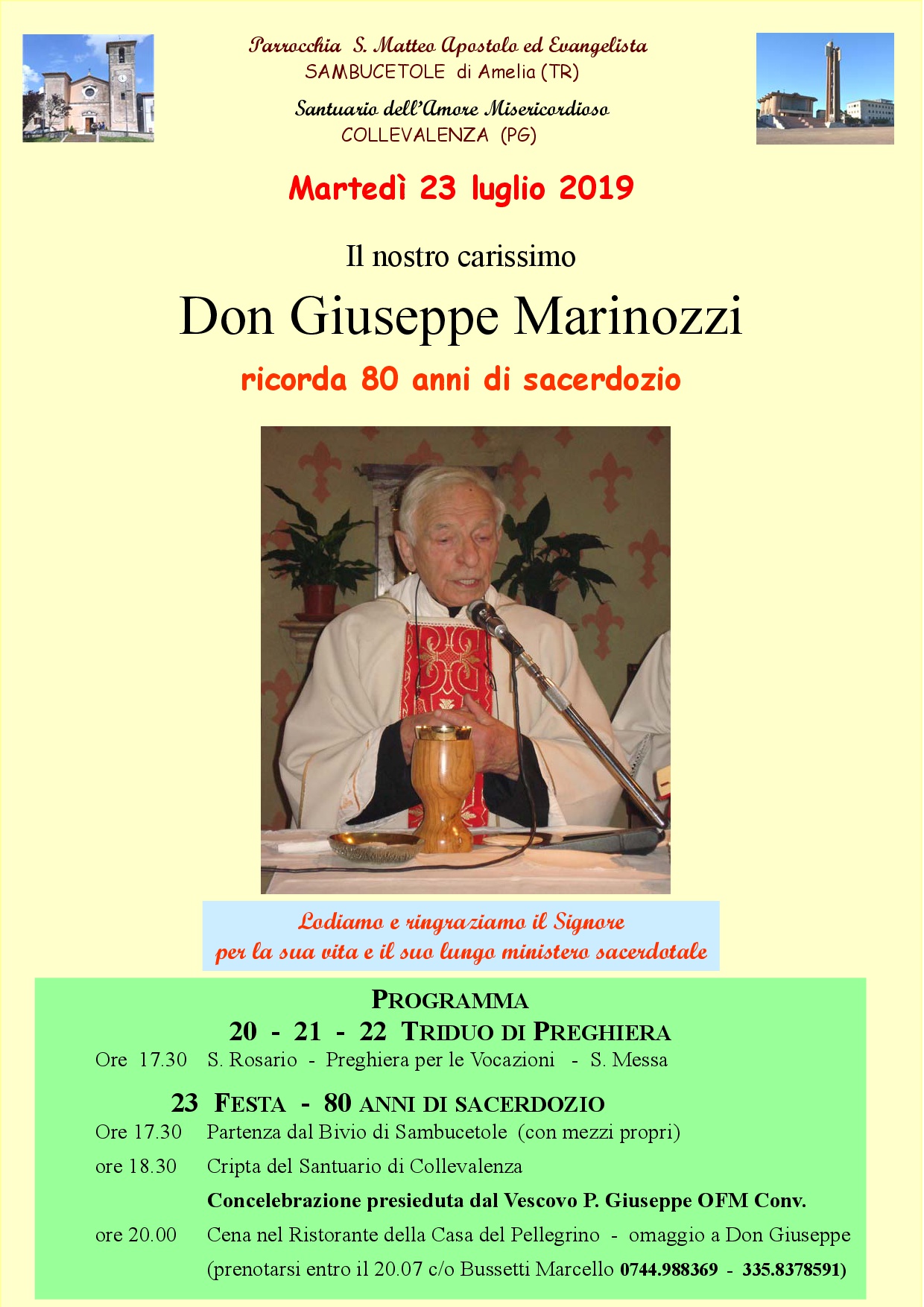 Martedì 23 luglio 2019 don Giuseppe Marinozzi, 104 anni di età, ha celebrato gli 80 anni di sacerdozio. Don Giuseppe è stato parroco per 73 anni di Sambucetole, oggi parroco emerito, ospite nella Comunità sacerdotale di Collevalenza. 80 anni di sacerdozio, un traguardo impensabile nella logica umana, eppure reale e vissuto con grande lucidità e partecipazione interiore, al di là degli inevitabili acciacchi e limiti dovuti alla sua veneranda età.