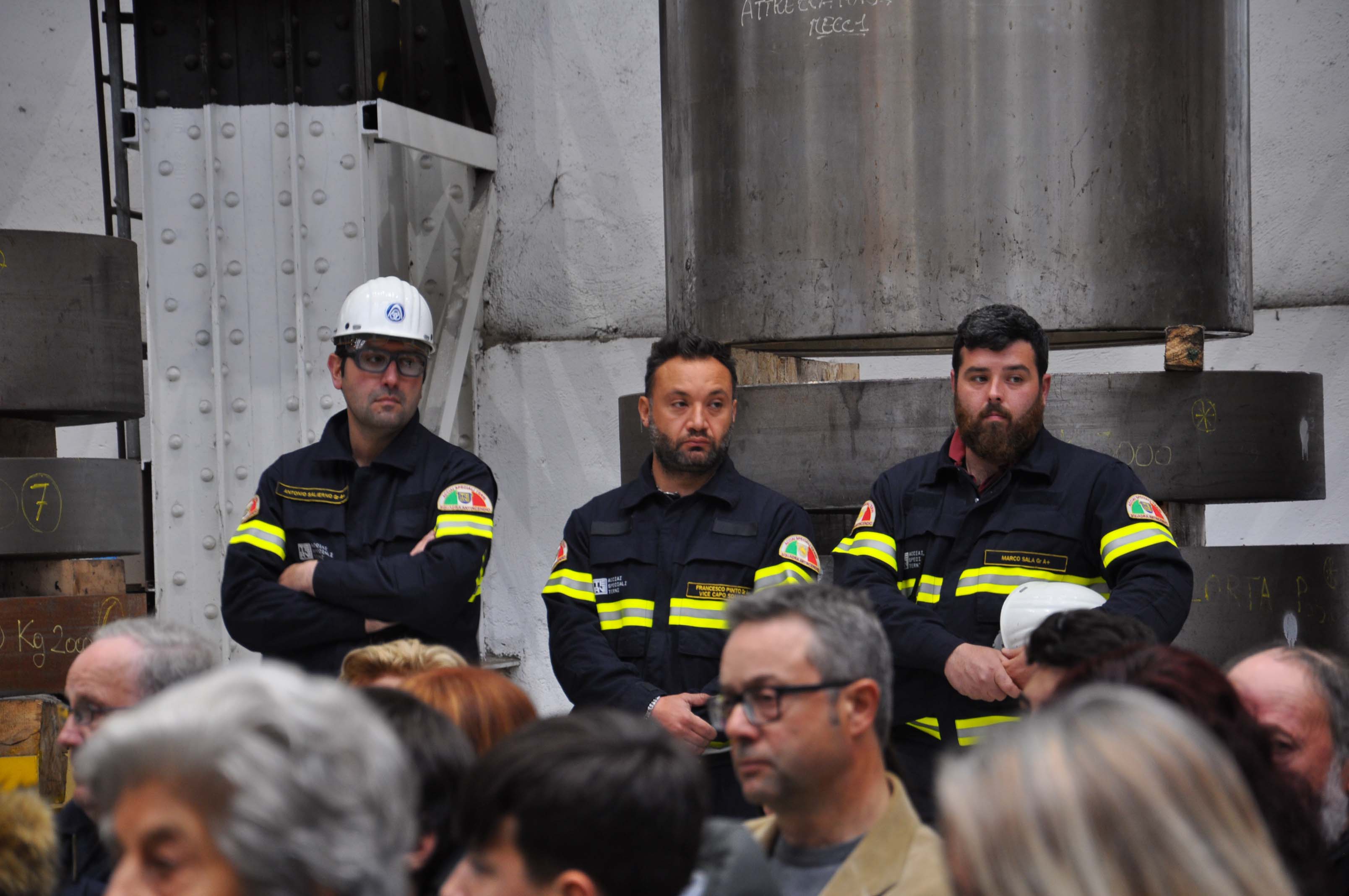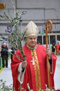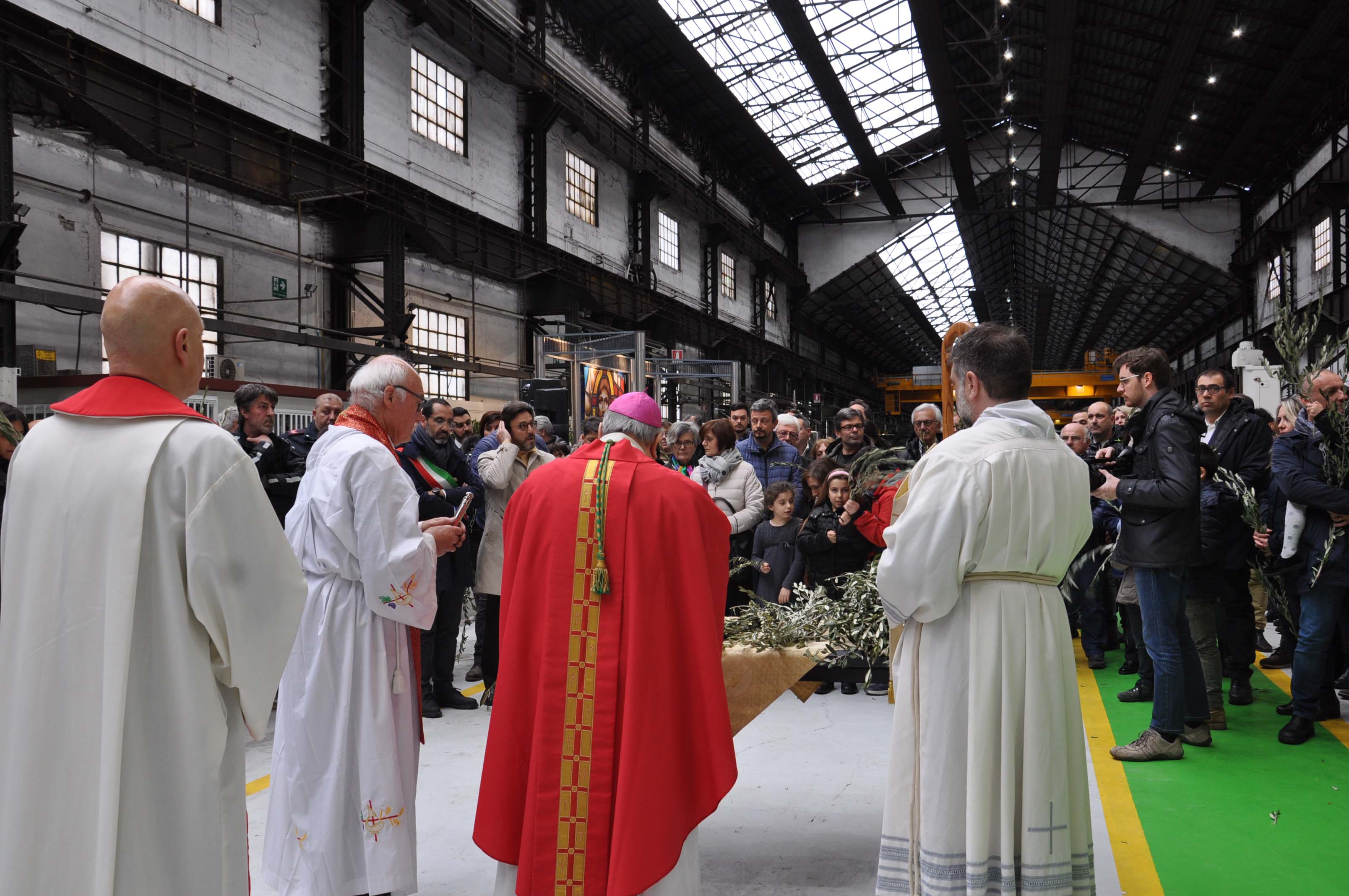 “Rinnoviamo la tradizione della Messa pasquale in questo luogo di lavoro particolare – ha detto il vescovo – che tiene alto il prestigio della nostra città, che con esso si identifica, complesso industriale, dove tanti uomini e donne con la loro fatica e con l’ingegno contribuiscono al benessere comune e allo sviluppo della società. La Santa Messa in questo luogo vuole essere anche espressione della attenzione e gratitudine della Chiesa per tutti voi. Iniziamo insieme una Settimana particolare per la Chiesa e i cristiani; è chiamata santa per il mistero che si ricorda e si rinnova: la Pasqua di Nostro Signore Gesù Cristo, la sua passione, morte e risurrezione. Non solo una commemorazione per non dimenticare, ma una memoria nel significato biblico, nella quale si rinnova e si attua per noi, per la potenza dello Spirito Santo, la grande opera della salvezza, compiuta da Gesù, per l’umanità, ma anche per tutti noi che partecipiamo con fede e devozione”.