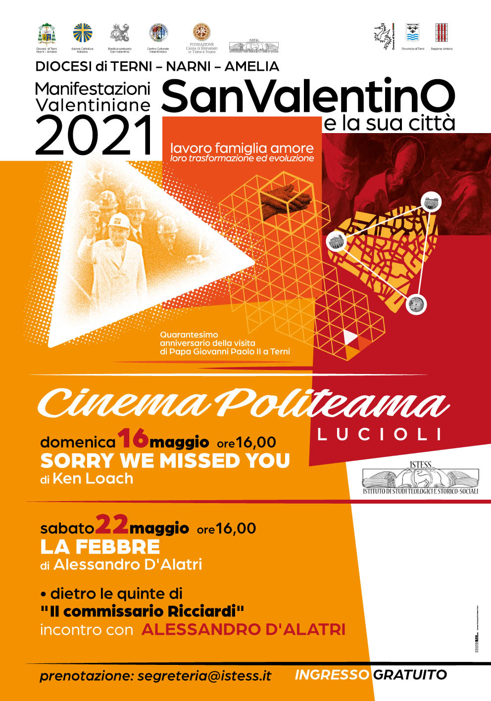 Due proiezioni filmiche, promosse per gli Eventi Valentiniani 2021 dedicati al tema del lavoro e della famiglia, si terranno presso al cinema Politeama Lucioli, organizzati dall’Istess. La prima è in programma domenica 16 maggio alle ore 16 con il film di Ken Loach “Sorry, we missed you” e la seconda proiezione sabato 22 maggio ore 16 con il film “La febbre” di Alessandro D’Alatri, sarà presente il regista.