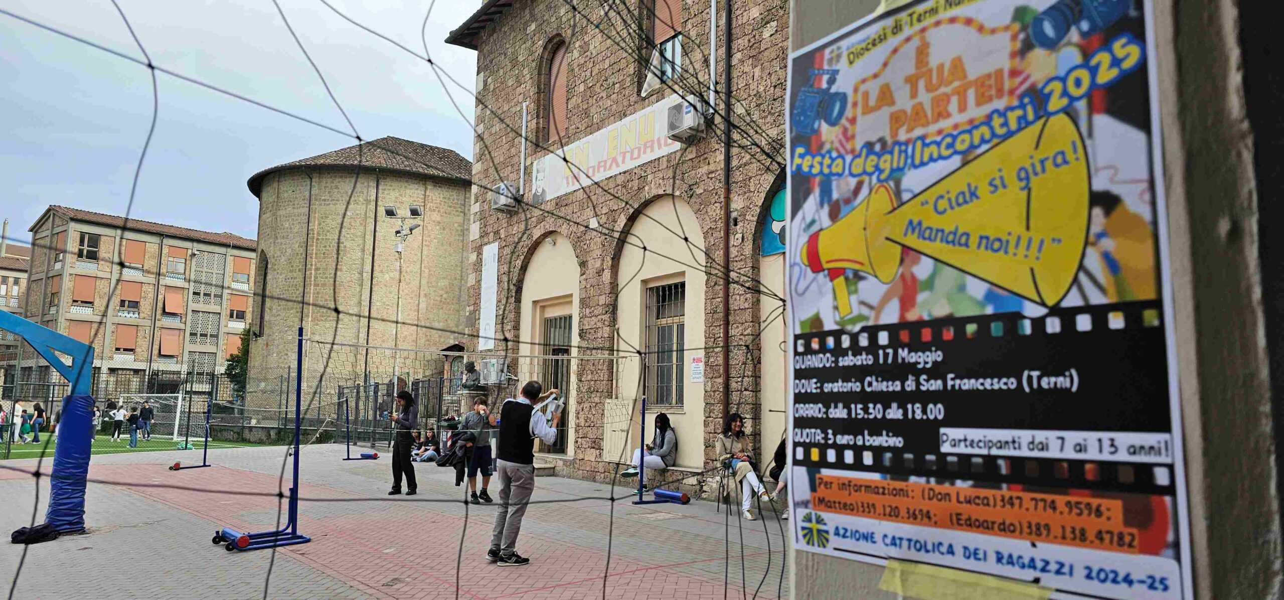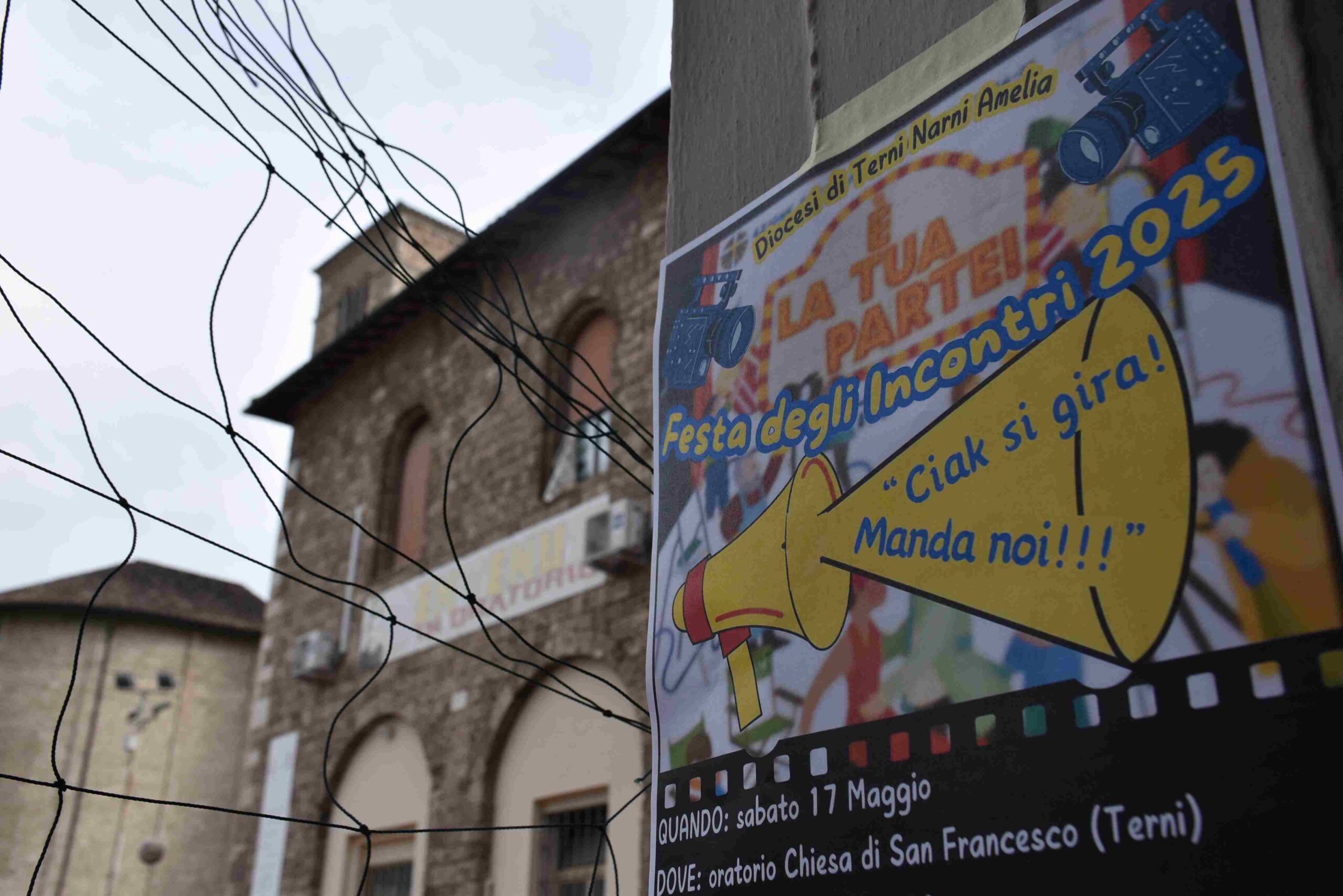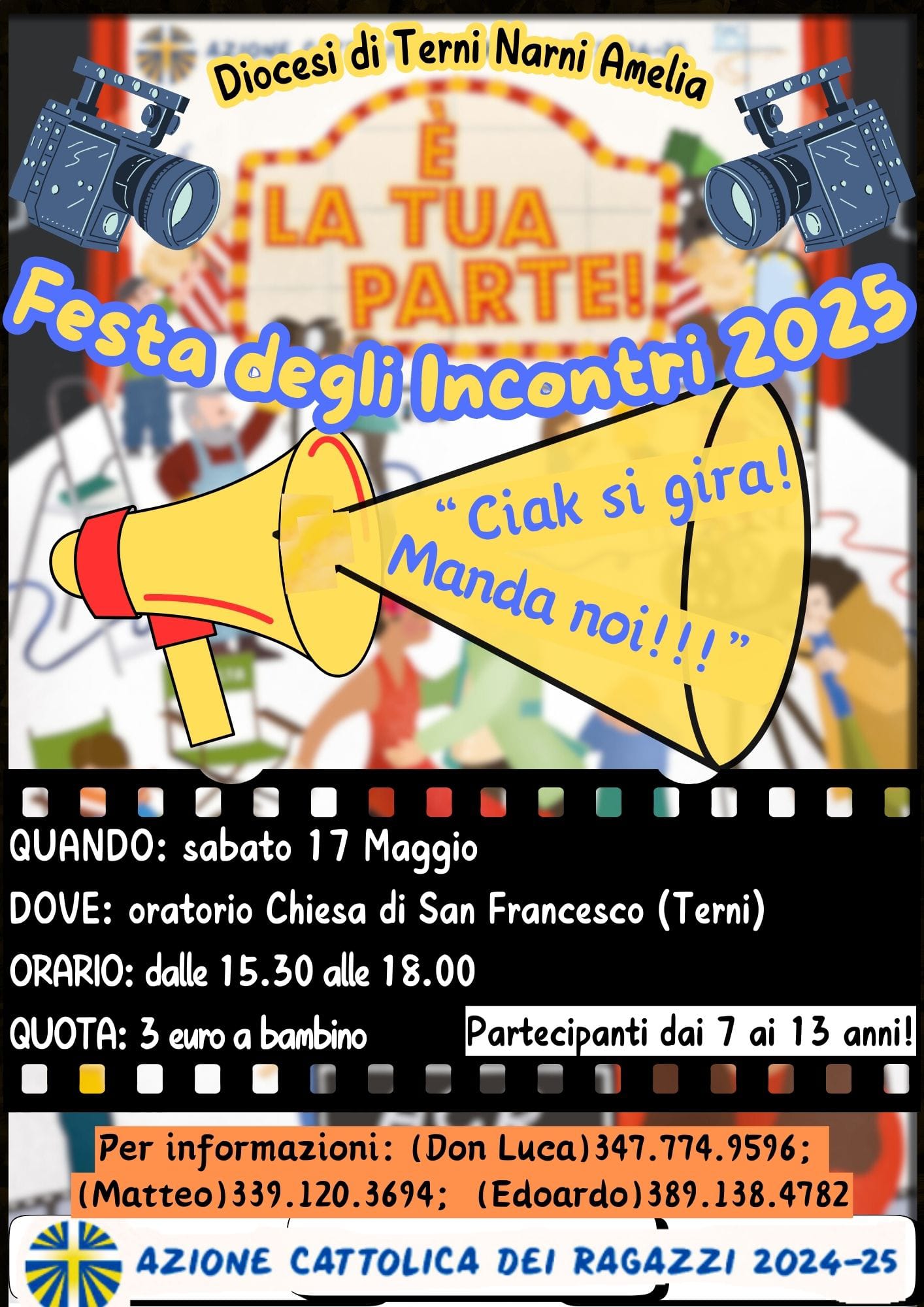 Sabato 17 maggio dalle ore 15,30 alle ore 18 si terrà la “Festa degli Incontri – Ciak si gira, manda noi!!” dell’Azione Cattolica Ragazzi, per tutti i ragazzi del catechismo, degli oratori, delle associazioni dai 7 ai 13 anni, presso l’oratorio San Giovanni Bosco della parrocchia di San Francesco a Terni.